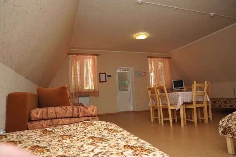 Номер расположен на первом уровне корпуса «Теремок» и позволяет отдохнуть как большой семьей так и шумной компанией. Имеет отдельный вход. Прилегающая территория оборудована мангалами, удобными столами для приготовления блюд и лавками для отдыха. Этот корпус ближе других расположен к пляжу и летнему кафе.