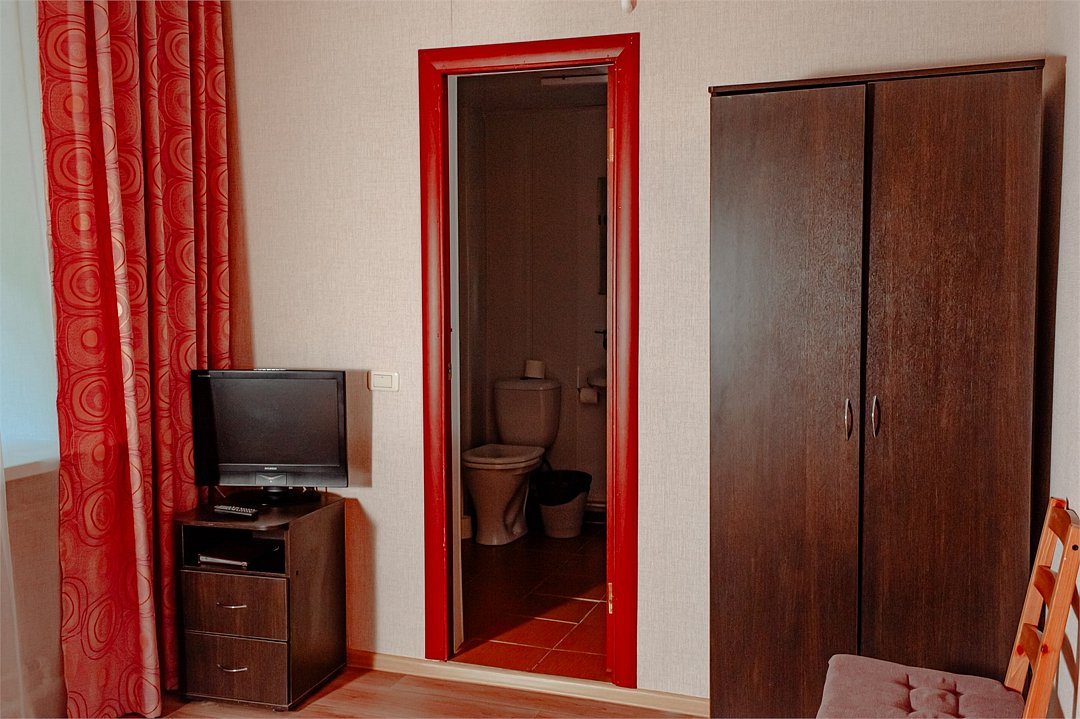 телевизор, система безопасности, душевая кабина, двуспальная кровать, тумбы, шкаф для одежды, зеркало, кулер на этаже, вид во двор, туалет, внутренний телефонВ номере