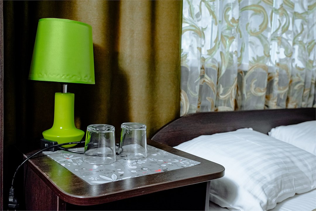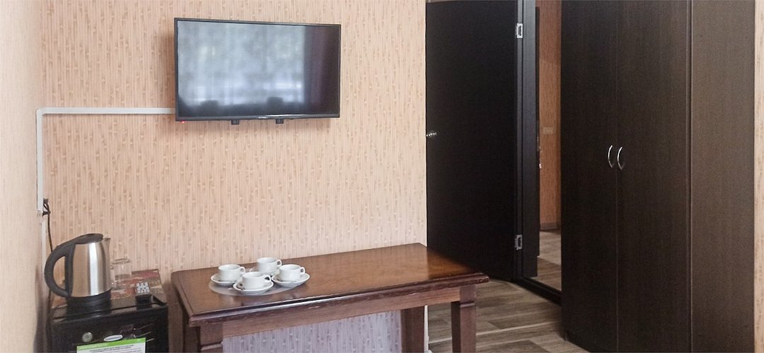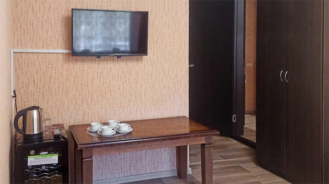 телевизор, IP-телефон, ванная комната, душевая кабина, санузел, две полутораспальные кровати, тумбы, вешалки, зеркало, информационная карта, меню, кулер на этаже, стаканы, стул, москитная сетка, гостиничная парфюмерияВ номере