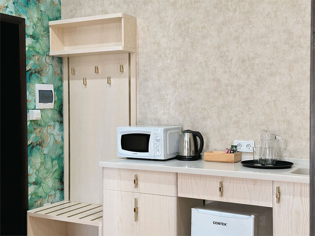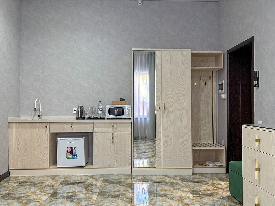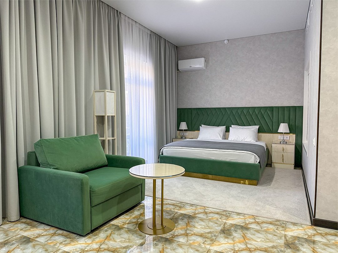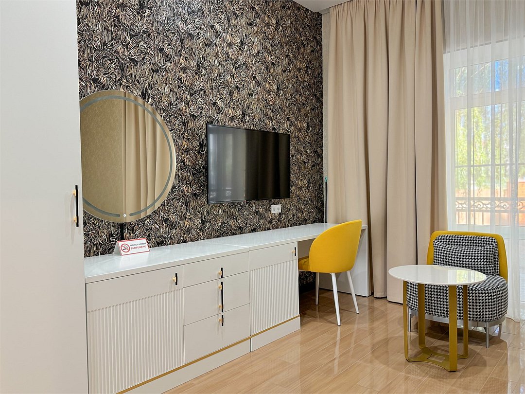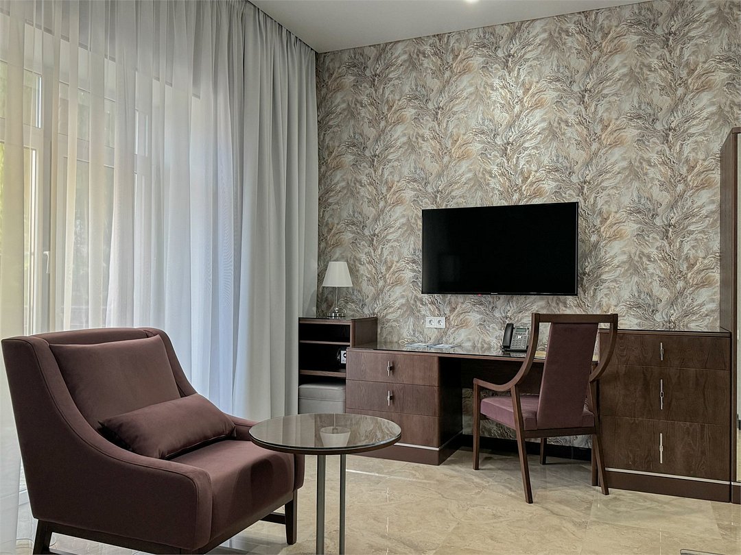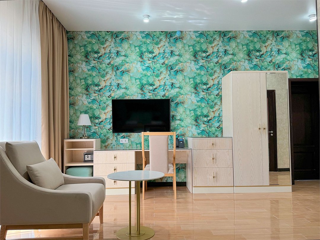 Просторный номер 35 кв.м с балконом, оформленный в современном стиле и с уютной планировкой, который подходит для комфортного проживания как для одного человека, так и для пары В номере: Двуспальная кровать размером 160×200 см с ортопедическим матрасом для комфортного и здорового сна Телевизор smart TV 50 дюймов Сплит-система Сейф для хранения ценных вещей Шкаф для одежды, оснащенный 10 плечиками, утюгом Открытая вешалка для верхней одежды, зеркало Микроволновка, чайник, мини-холодильник. В номер поставляется ежедневно бутилированная минеральная вода Рабочая зона с телефоном, удобным креслом В санузле: Ванна с подачей термально-минеральной воды (по назначению врача и под присмотром мед.персонала) Фен, халат, тапочки, набор одноразовой косметики Набор из 5 полотенец Сушилка для белья Лакониум (подогреваемая платформа) Унитаз и гигиенический душ Внимание! Фотографии номера являются примером категории данного типа. Реальный интерьер номера и его цветовая гамма могут отличатьсяУслуги и удобства