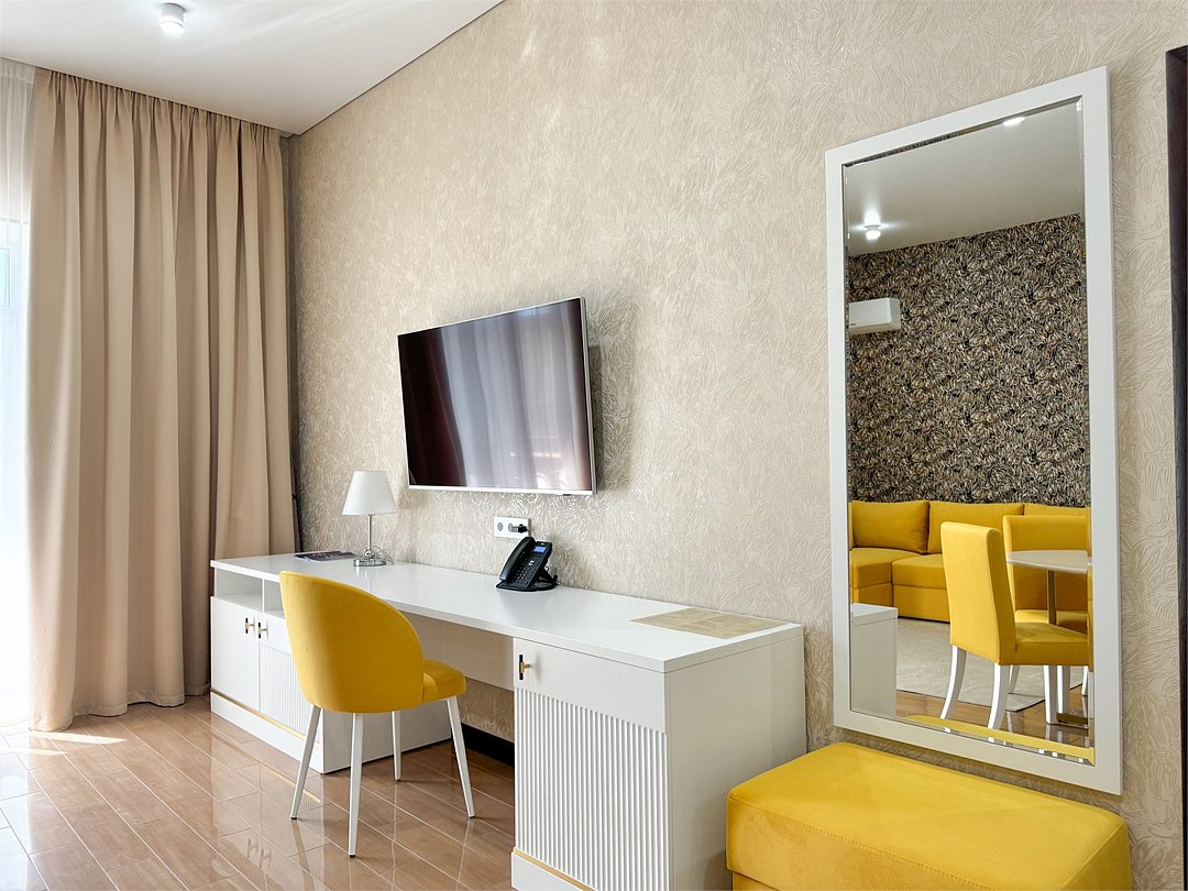 два телевизора, Wi-Fi, интернет, телефон, светильник, настольные лампы, фен, электронные замки, микроволновая печь, утюг, ванная комната, ванна, санузел, халаты, банные полотенца, пляжные полотенца, тапочки, гигиенические средства, косметические средства, балкон, балкон с красивым видом, двуспальная кровать, кресла, стулья, шкаф для одежды, вешалки, письменный стол, зеркало, эксклюзивная мебель, две комнаты, чайный набор, обслуживание номеров, сейф, чайник, унитаз, мягкая мебель, косметическое зеркало, питьевая вода, отдельный вход в номер, вид во двор, высокие потолки, кухонная посуда, стаканы, тумба, туалет, сплит-система, панорамные окна, диван-кровать, раскладной диван, телевизор с плоским экраном, мини-холодильник, мини-кухня, телевизор со Smart TV, вид на бассейн, собственный бассейн, пуфик, гигиенический душ, уборка номера, набор для приготовления чая и кофе, услуги прачечной (платно), туалетные принадлежности премиум-класса, шапочка для душа, мыло, окна от пола до потолкаВ гостиничном номере