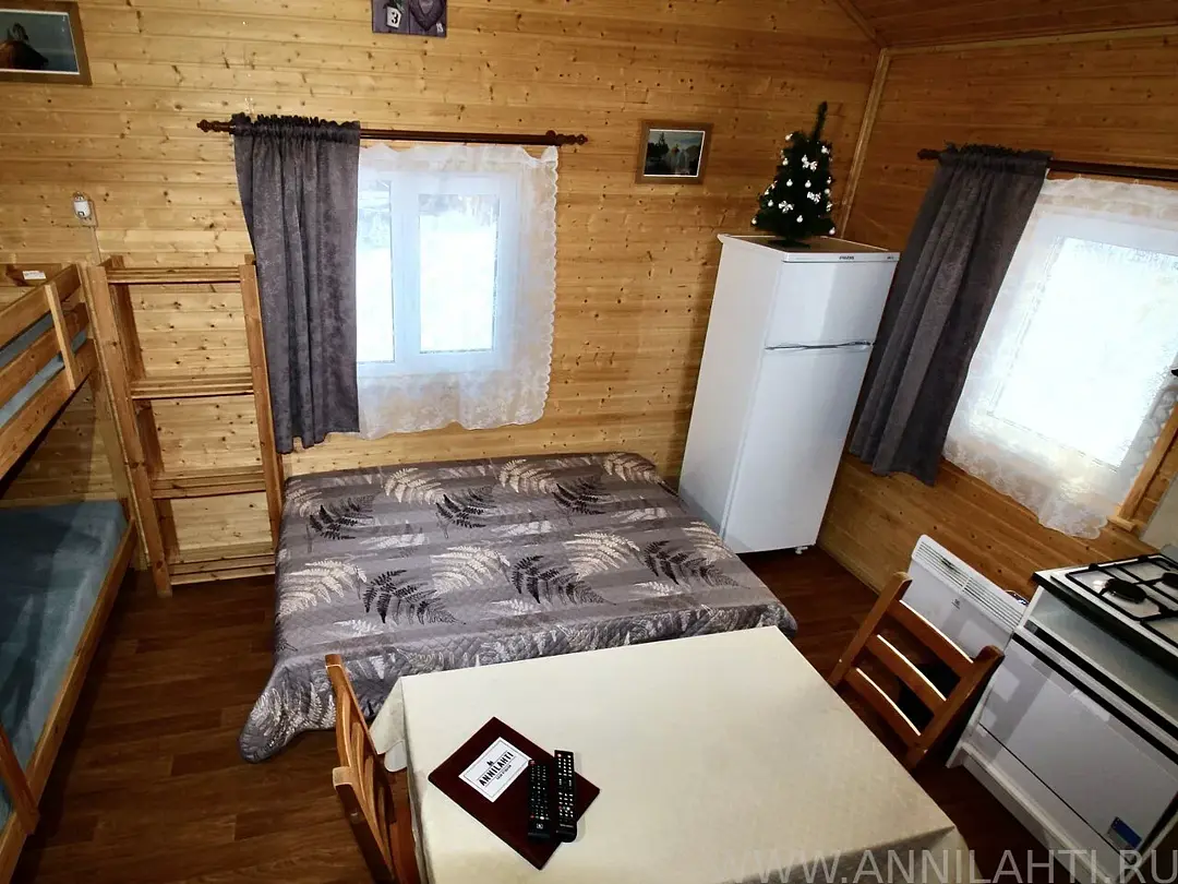 В большой комнате коттеджа есть двухэтажная кровать, тахта, обеденный стол, камин, холодильник, спутниковое телевидение, небольшая кухня с газовой плитой, мойкой, вытяжкой, микроволновкой и набором посуды.