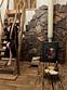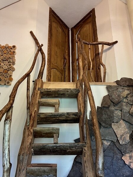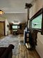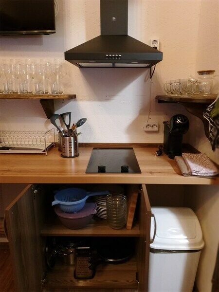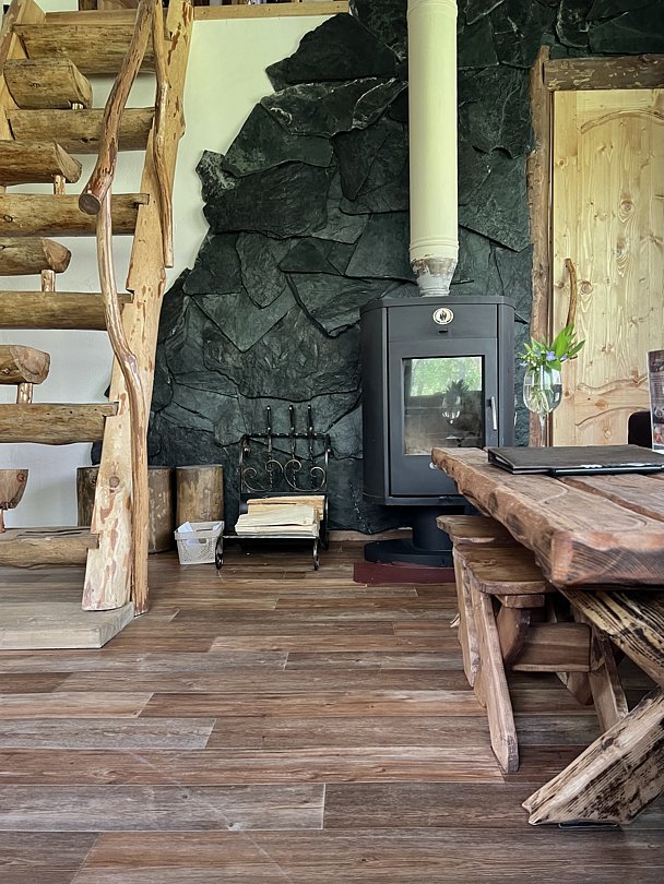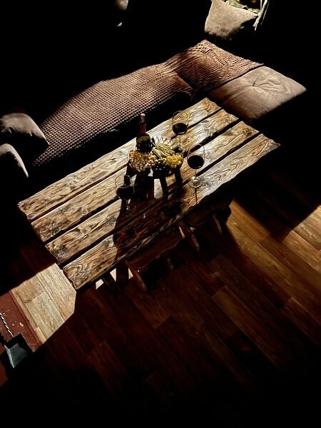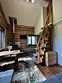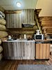 Первый этаж представляет собой просторную студию, в которой есть : кухня-гостиная со всем необходимым: печь-камин, варочная панель, посуда, столовые приборы, микроволновка, электро-чайник, холодильник, обеденный стол ручной работы, угловой диван-кровать. Сан-узел: душевая кабина, раковина с умывальником, унитаз.