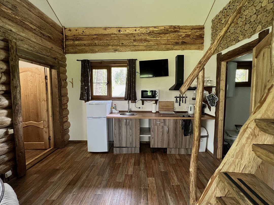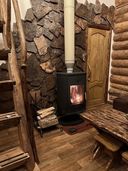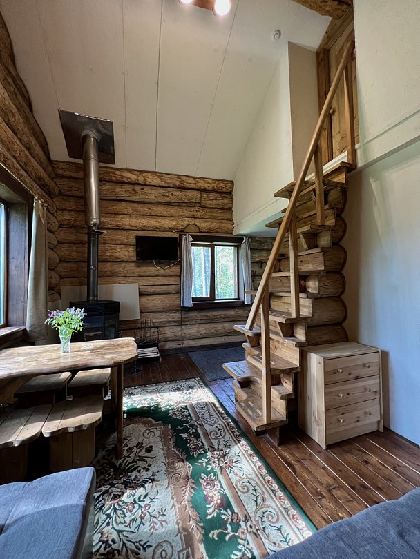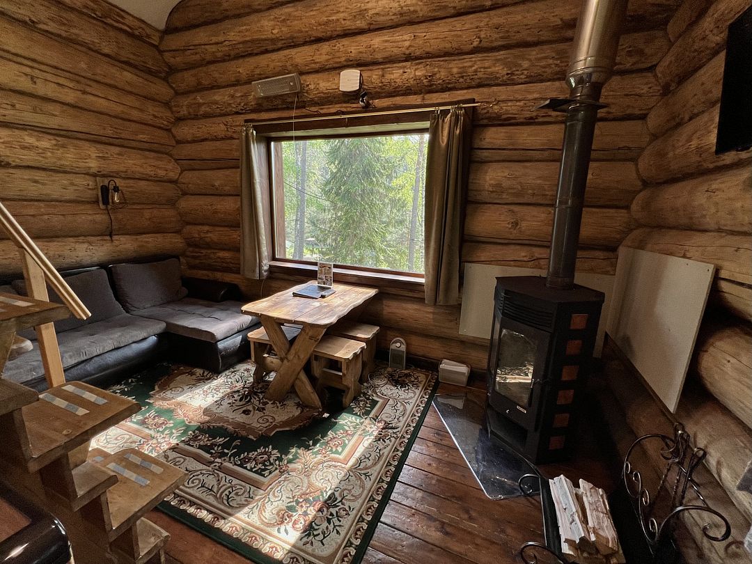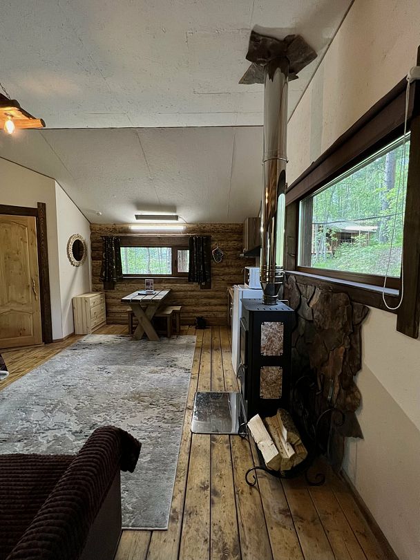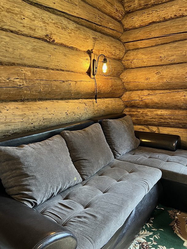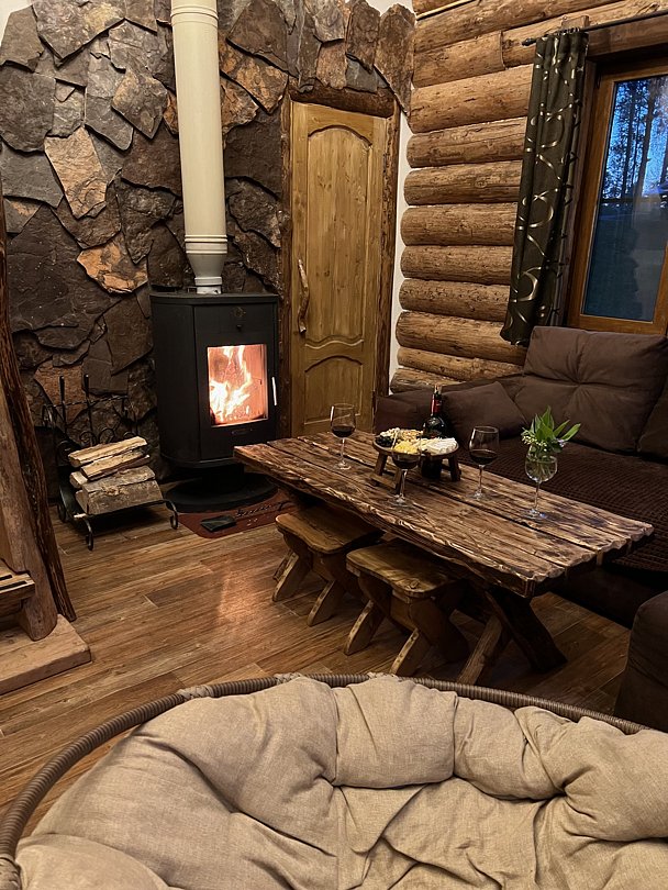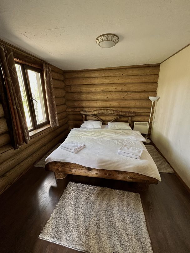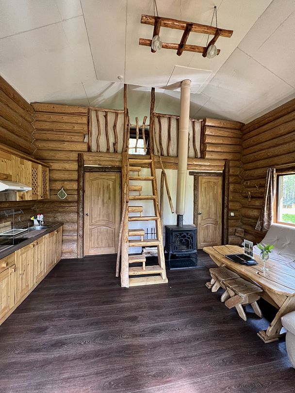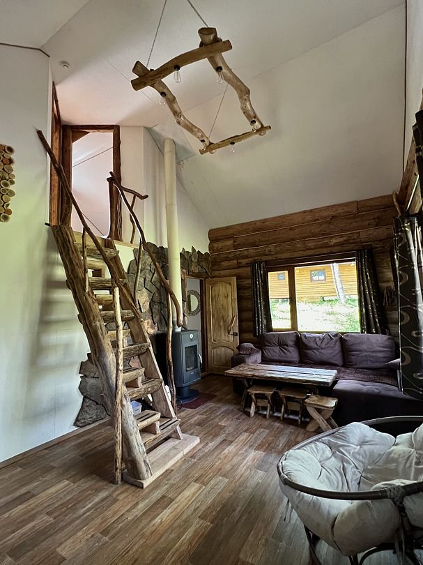 На первом этаже расположена отдельная спальня с двуспальной кроватью, кухня-гостиная со всем необходимым: печь-камин, варочная панель, посуда, столовые приборы, микроволновка, электро-чайник, холодильник, обеденный стол ручной работы, угловой диван-кровать. Сан-узел: электро-сауна, душевая кабина, раковина с умывальником, унитаз.