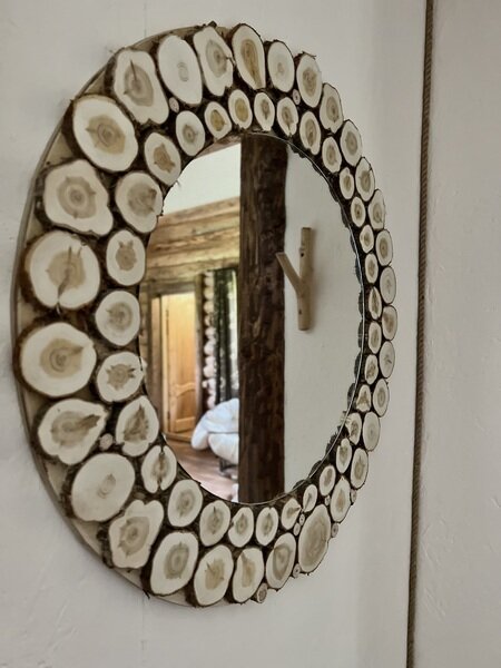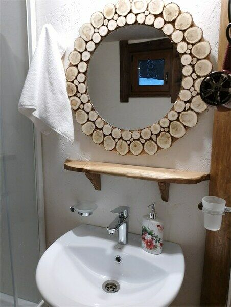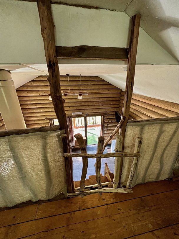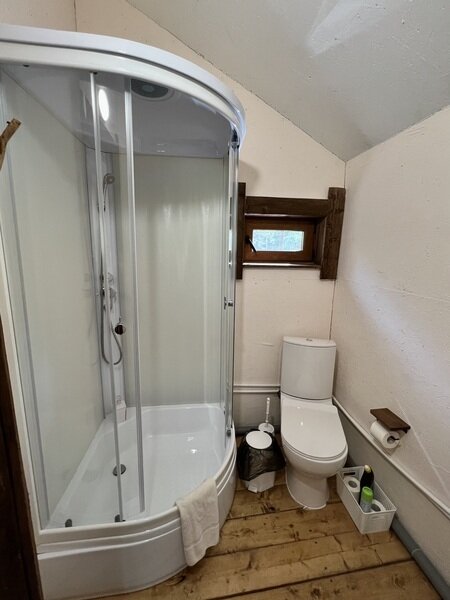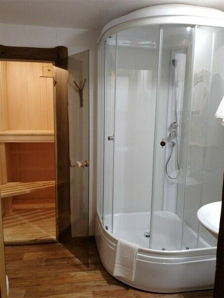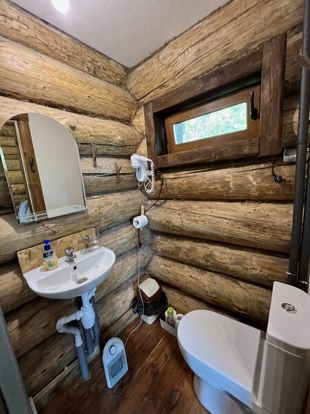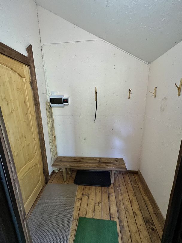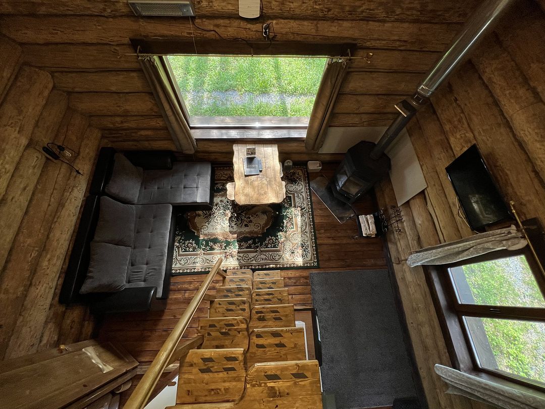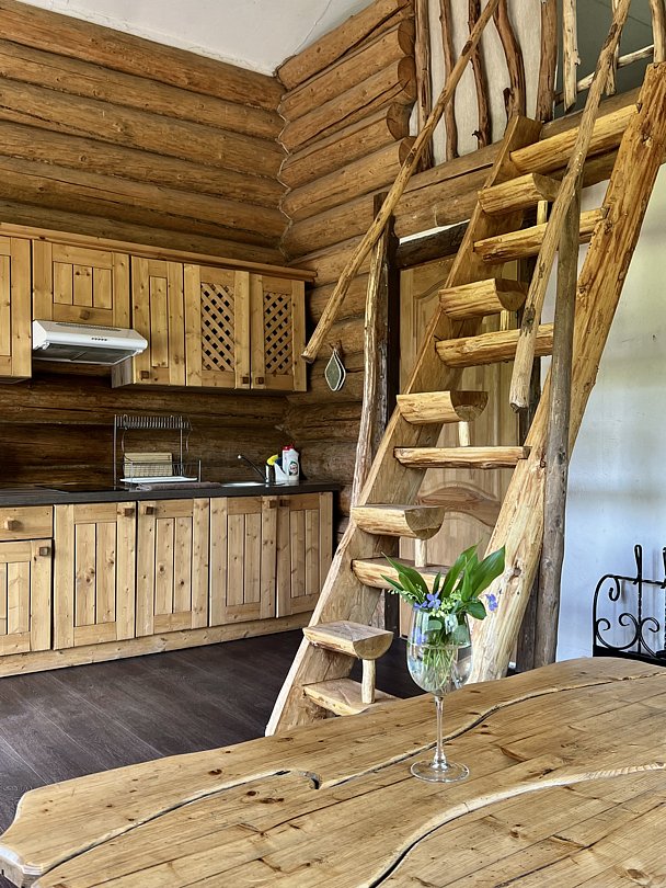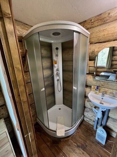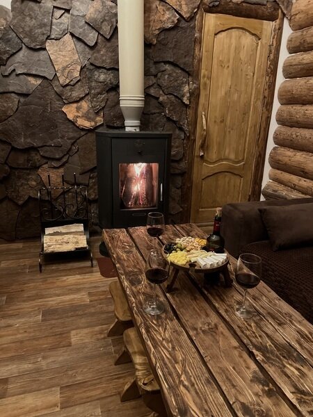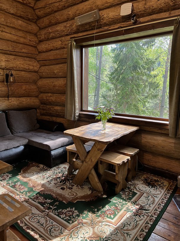 На первом этаже расположена отдельная спальня с двуспальной кроватью, кухня-гостиная со всем необходимым: печь-камин, варочная панель, посуда, столовые приборы, микроволновка, электро-чайник, холодильник, обеденный стол ручной работы, угловой диван-кровать. Сан-узел: электро-сауна, душевая кабина, раковина с умывальником, унитаз.