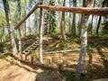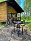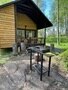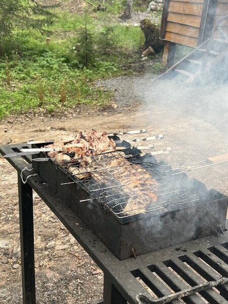 Перед террасой кованый мангал с шампурами у каждого коттеджа.