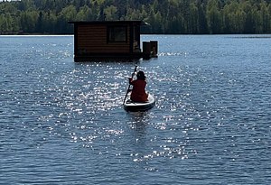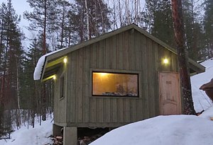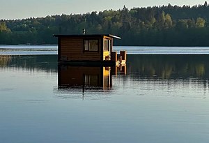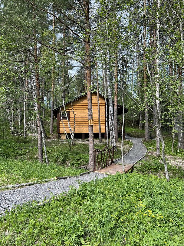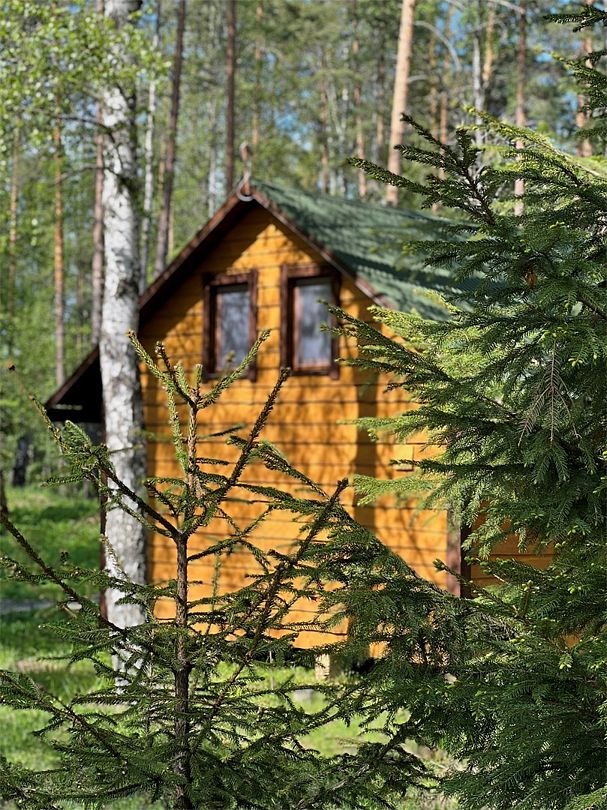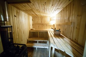 Баня находится в отдалении от коттеджей, за пригорком прямо на берегу озера Светоч (Ханкасъярви). Гости после парения могут окунуться в чистейшую воду озера как летом, так и