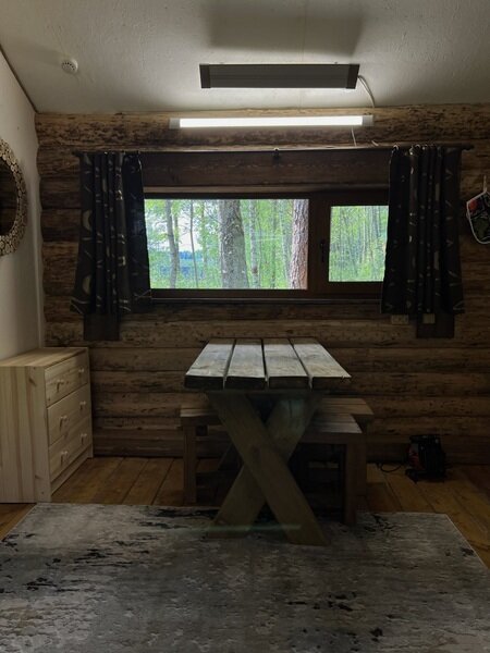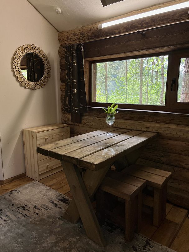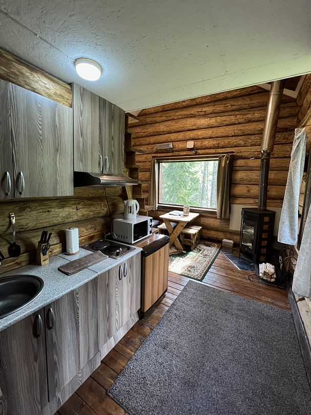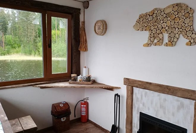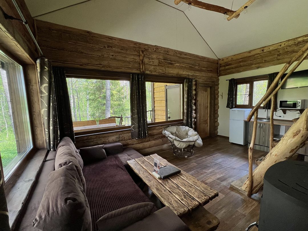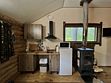 Одноэтажный коттедж представляет собой просторную студию, в которой есть : кухня-гостиная со всем необходимым: печь-камин, варочная панель, посуда, столовые приборы, микроволновка, электро-чайник, холодильник, обеденный стол ручной работы, небольшой диванчик-кровать. Сан-узел: душевая кабина, раковина с умывальником, унитаз.