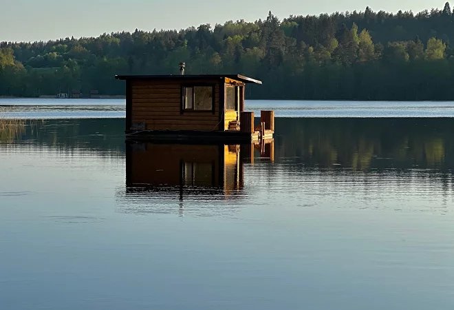 Специальный домик, расположенный на глади водоёма, оборудован всем необходимым для комфортного посещения бани.