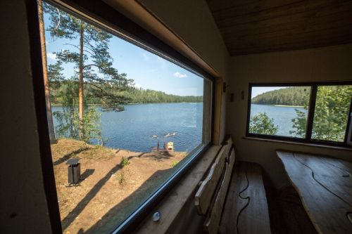 Баня с панорамными окнами на берегу озера. Рассчитана на компанию до 8 человек.