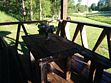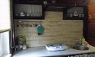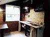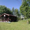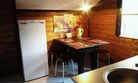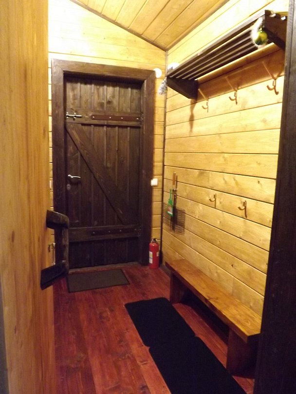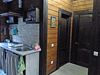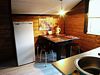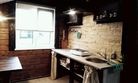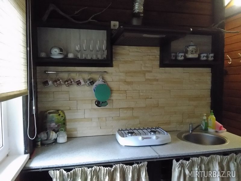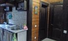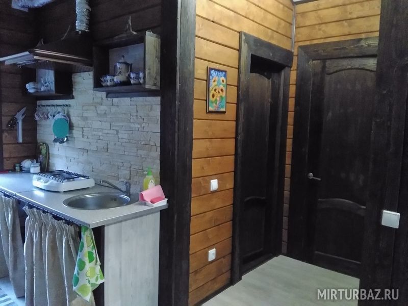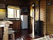 В домике имеется прихожая, санузел с унитазом и душем, комната с мини кухней, двуярусной кроватью на 4 человека и открытая веранда со столом.
