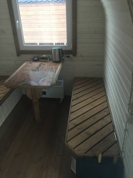 Коттедж представляет собой единое пространство: 1 этаж кухня-спальня-гостиная, 2 этаж-лофт спальня. Идеален для семьи, пары или небольшой компании родственников. Внутри полностью оборудованная кухня с плитой, чайником, микроволновкой, холодильником, посудомоечной машиной. В наличии есть вся необходимая посуда — тарелки, стаканы, сковородки, кастрюли, столовые приборы.