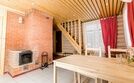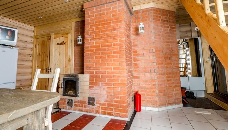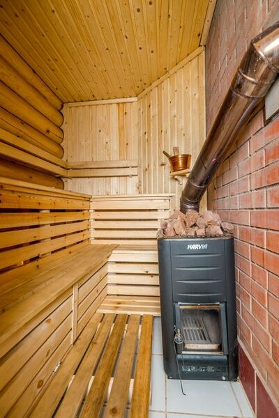 На 1 этаже дома расположена кухня-столовая с большим кожаным диваном, обеденным столом и необходимой техникой (варочная панель, холодильник, телевизор). Также имеется санузел, душевая и дровяная сауна.