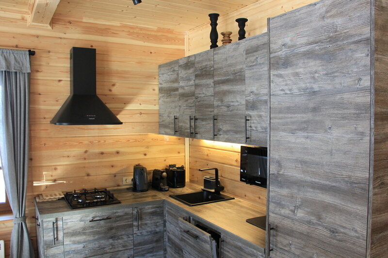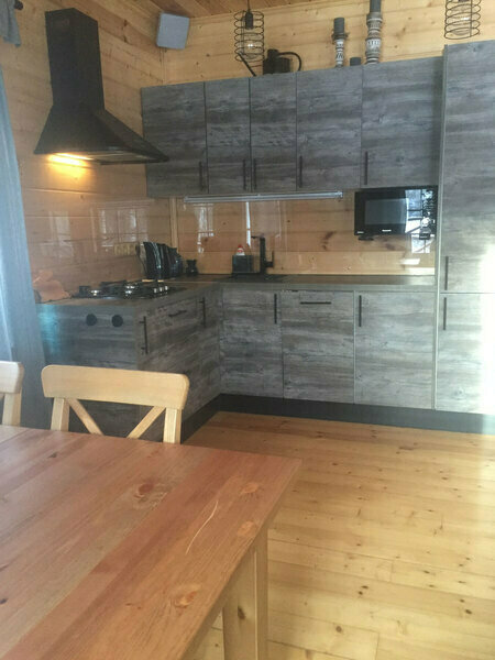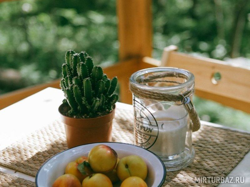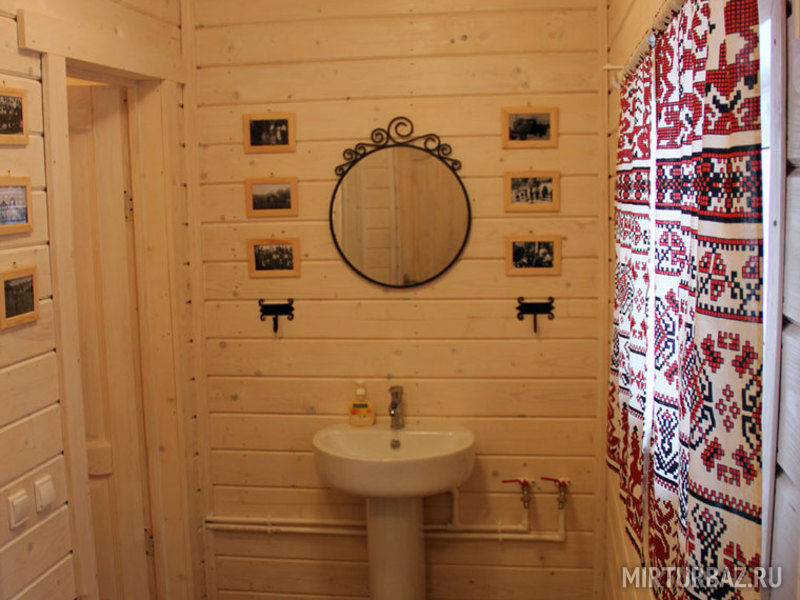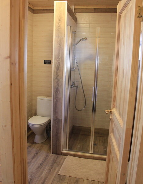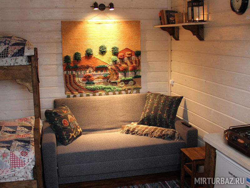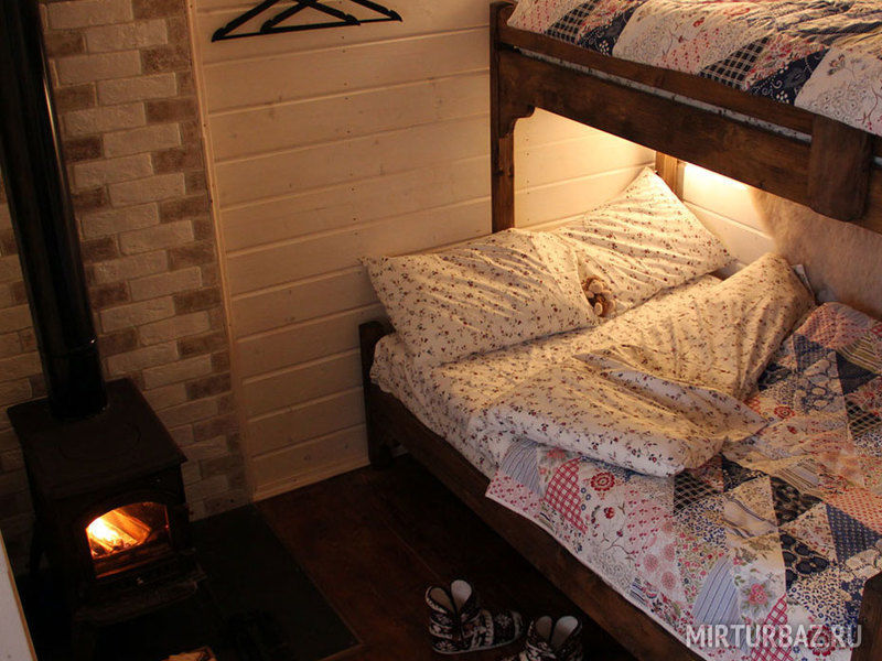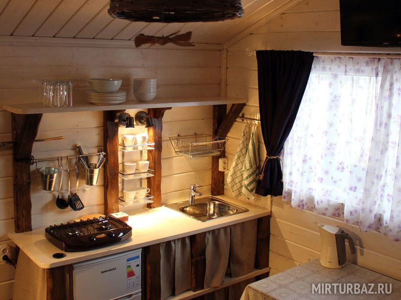 Внутри домики обставлены экологичной мебелью и оборудованы всеми теми предметами и техникой, которые помогают создать комфорт и дополнить ощущение того, что Вы находитесь дома, а именно: спутниковое ТВ, уютная печка-камин, электрический чайник, холодильник, включая морозильную камеру, плита (газовая), посуда для сервировки и приготовления любимых Вами блюд, а также постельные комплекты, тапочки и полотенца для каждого нашего гостя. Туалеты и современные душевые находятся вне домиков, они расположены в здании по соседству, всего в двух шагах от Вашего размещения. А на личной террасе у каждого домика установлен собственный мангал.