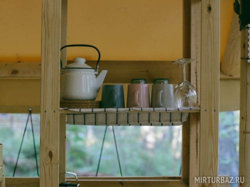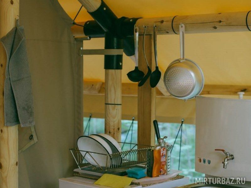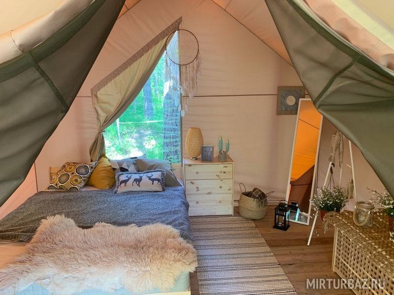 Комфортные палатки в оригинальном дизайне для семейного отдыха оборудованные мини-кухней со всей необходимой посудойгазовыми конфорками, холодильником, а также зоной BBQ для приготовления пищи на костре.Уникальный интерьер .Внутри глэмпинга установлены кровати с пружинными матрасами и белоснежным бельем. Пространство обставлено мебелью и оригинальными предметами интерьерного декора. Туалеты и современные душевые находятся вне домиков, они расположены в здании по соседству, всего в двух шагах от Вашего размещения.