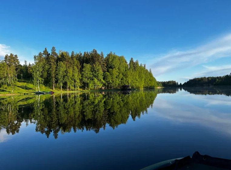 Аренда лодок с мотором в Карелии. В комплект аренды входит лодка с мотором до 5 л.с., спасательные жилеты и весла. Удобный спуск к воде в тихой лагуне Ладожских шхер.
