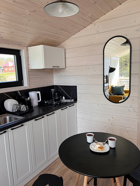 - бревенчатый дом с отоплением, в доме 4 спальни (2 чел. — отдельные кровати с возможностью совмещения, 2 чел. — большая двухместная кровать, 2 чел. — отдельные кровати с возможностью совмещения, 3 чел. — отдельные кровати с возможностью совмещения);