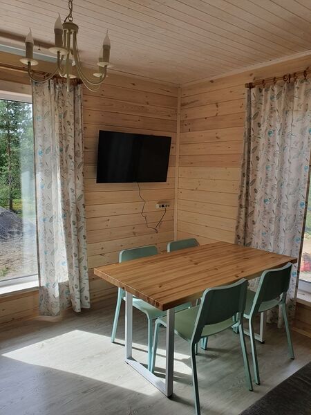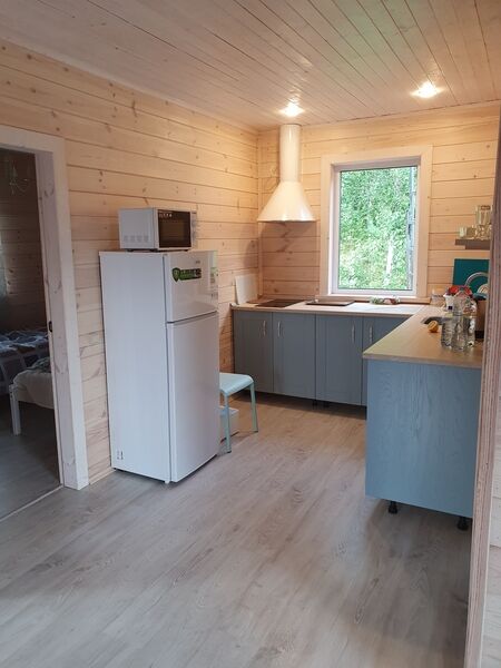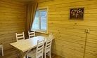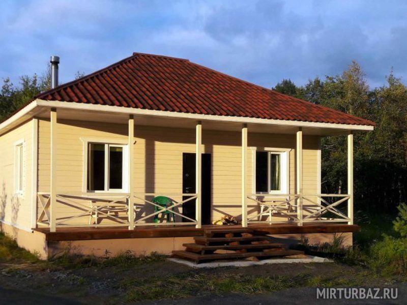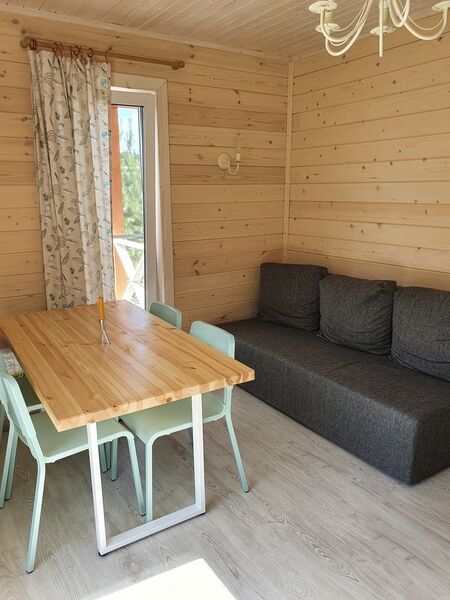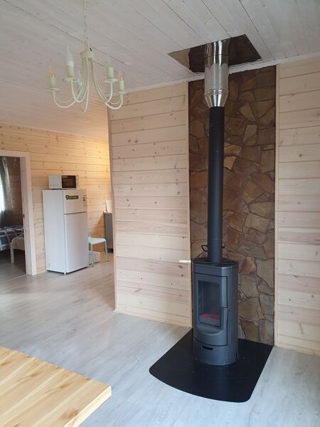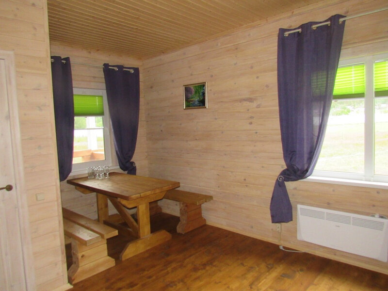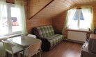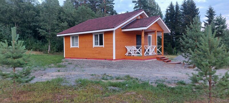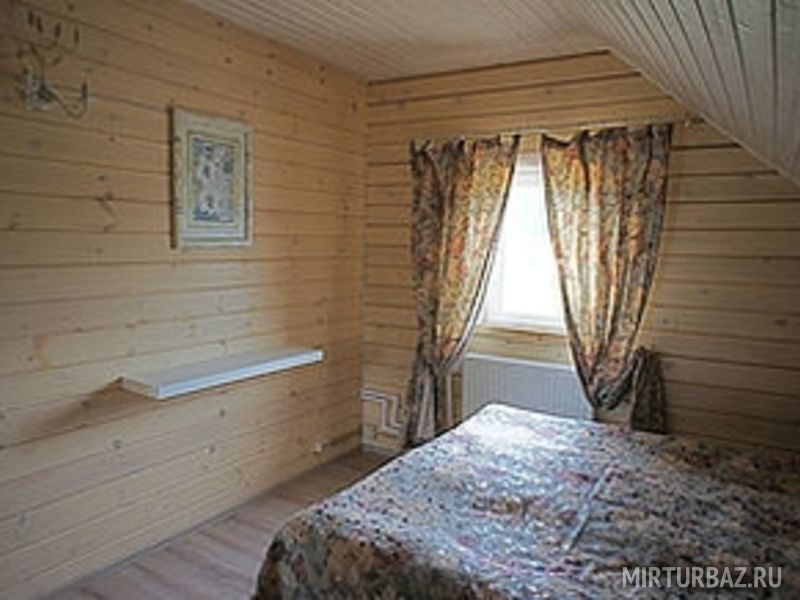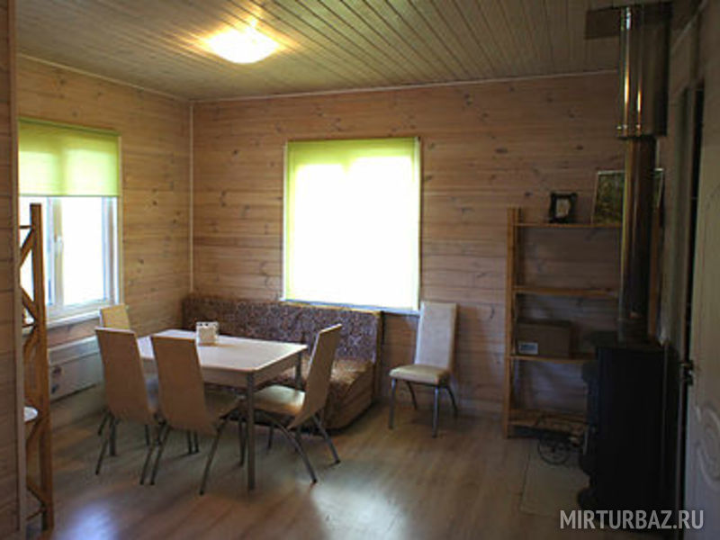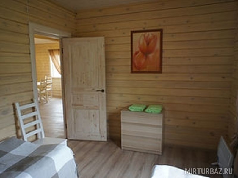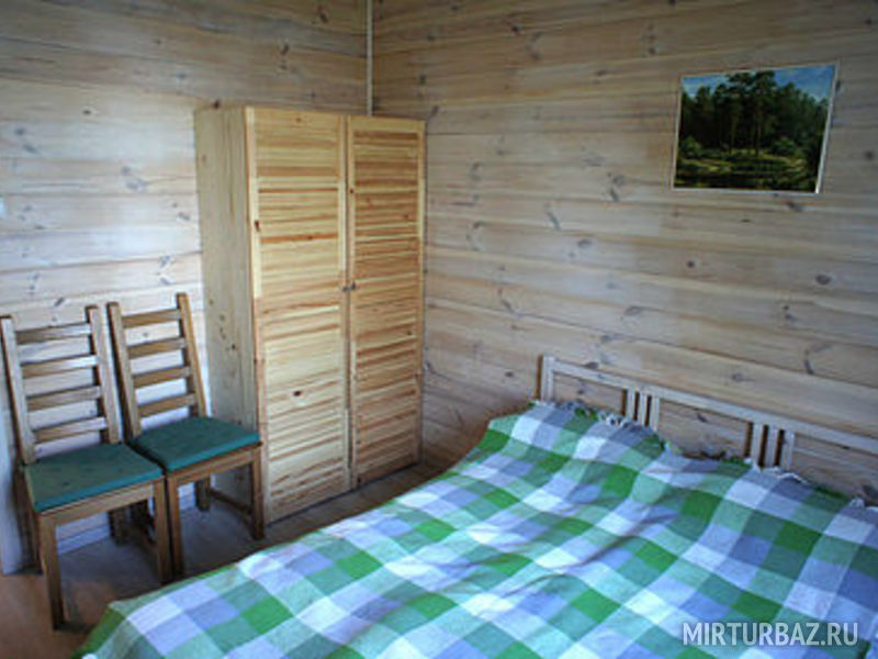 Уютный, одноэтажный коттедж, рассчитанный на прием 4-х человек. В доме оборудовано две спальни (одна с двуспальной и одна с двумя односпальными кроватями), кухня с холодильником, электроплитой, микроволновкой, набором посуды и столовых приборов, гостиная с раскладывающимся диваном (2 дополнительных спальных места), обеденным столом, дровяным камином, телевизором. Санузел оснащен душем. Постельное белье и полотенца предоставляются бесплатно (входит в стоимость проживания).