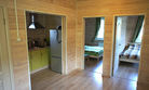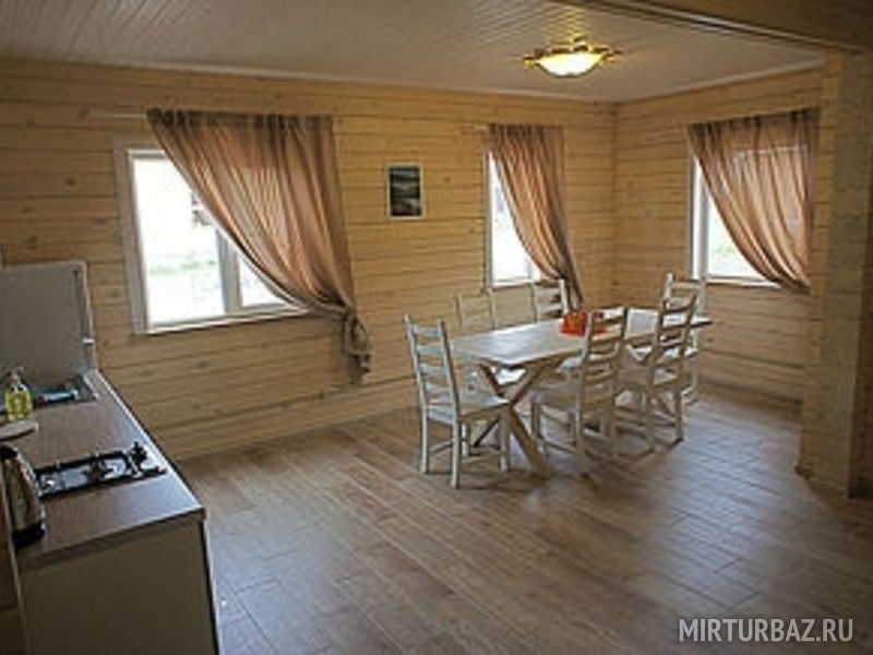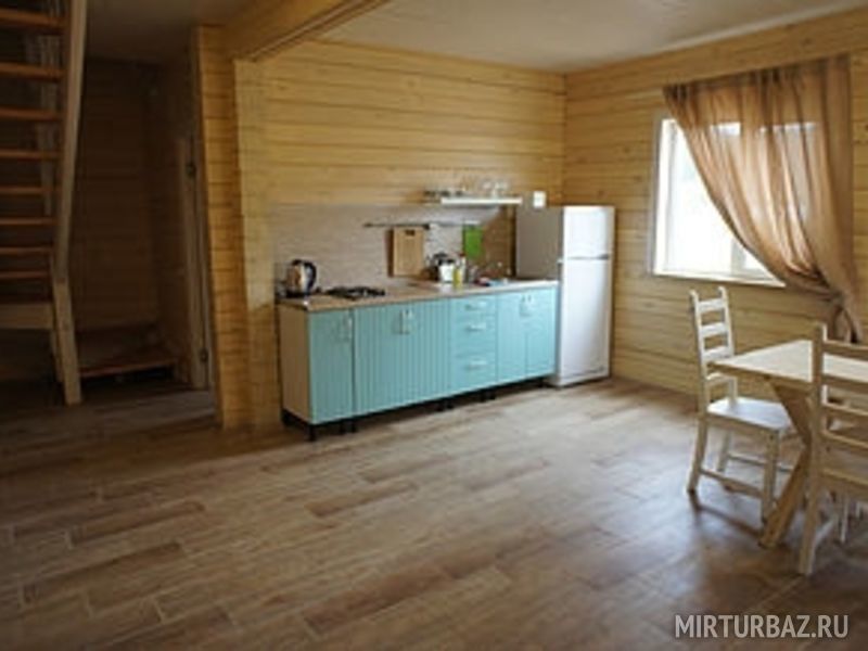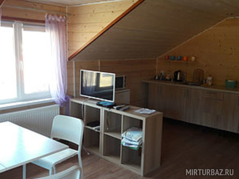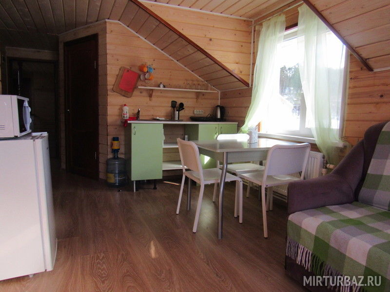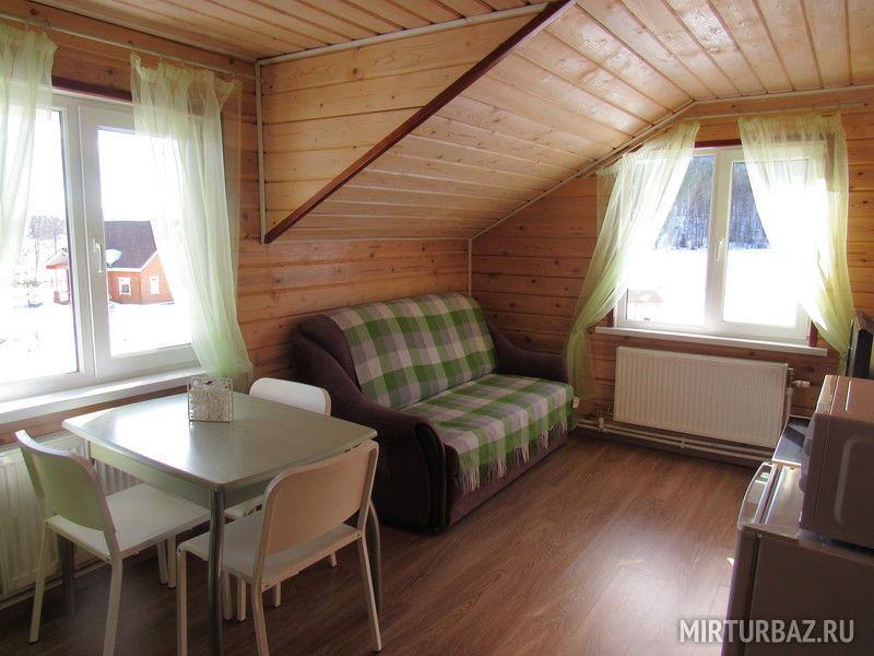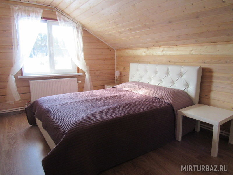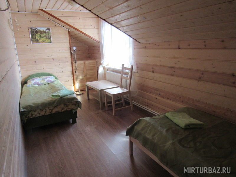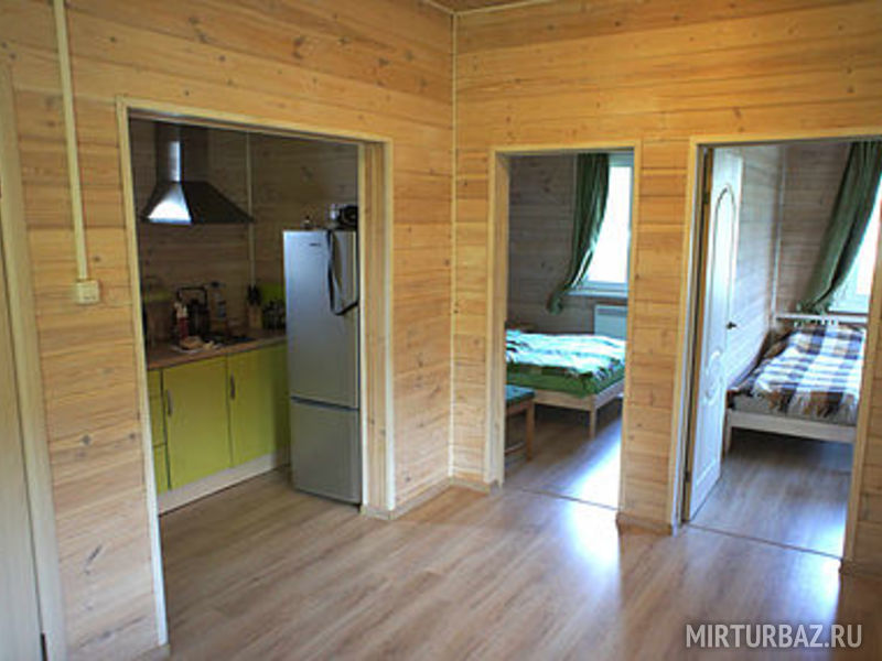 Два двухэтажных 3-х комнатных апартамента в одном дуплекс-коттедже из бруса. Каждый из которых имеет две спальни (одна с двухспальной кроватью на 1-ом этаже и вторая с тремя односпальными кроватями на 2-ом этаже), просторную гостиную-кухню (с большим обеденным столом, набором посуды, холодильником, плитой, микроволновкой, электрочайником, музыкальным центром и телевизором), и санузлом с душем.