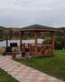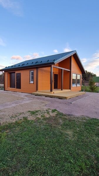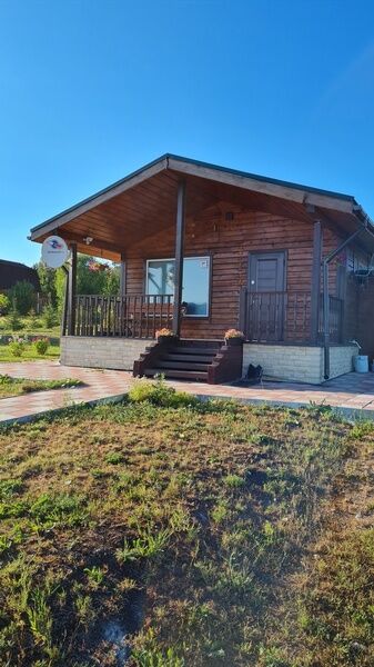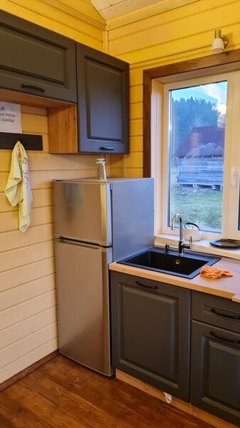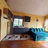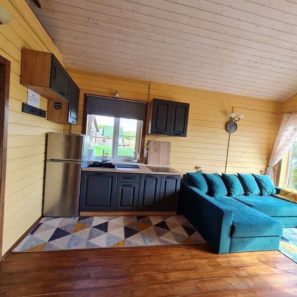 В домике имеется кухня, удобства, двухспальная кровать + двуспальный диван.