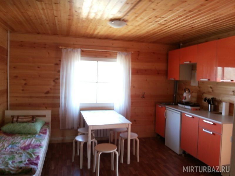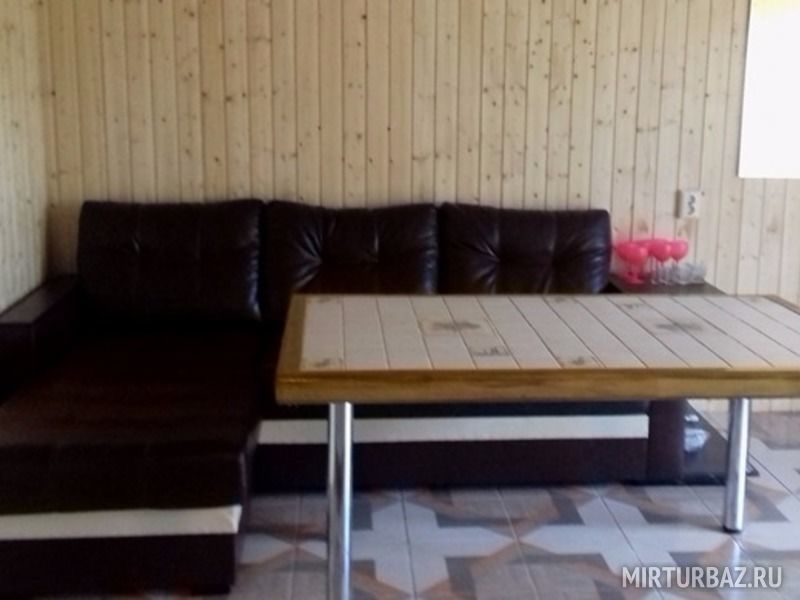 В отдельном доме для гостей подготовлены две комнаты: полностью укомплектованная кухня с большим угловым диваном и спальня, рассчитанная на 5 спальных мест.