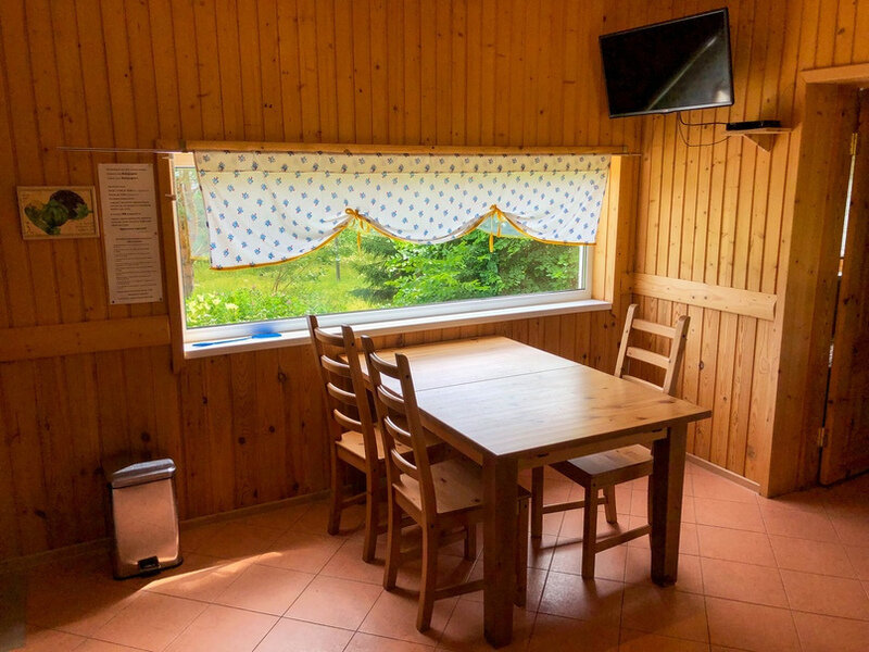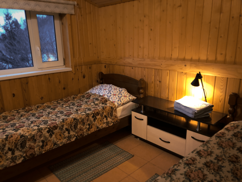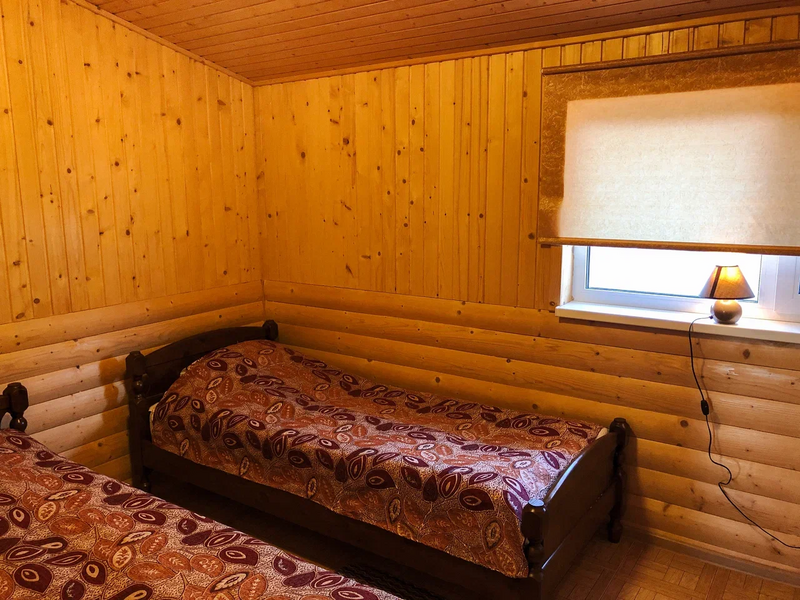 Семейный отдыхДостоинстваБыли с 11 по 15 июля. Никита, хозяин, доброжелательный и отзывчивый молодой человек. У нас был домик с баней. Замечательный. Хуторок Бабаягино, немного на отшибе, уединённо, нет никого рядом, полный релакс. Просторная кухня-столовая с большим столом, есть всё необходимое, посуда, кастрюли, сковородки, даже турка и чайничек. Микроволновка, холодильник, плита электрическая. Вид на полянку и кусочек озера, а ещё прикольная сосна там. Небольшая спальня с двумя удобными кроватями. В закуточке туалет, душ, что удобно, на полу, не кабина. А в конце банька небольшая с печкой и камнями. На улице есть дровяник с берёзовыми поленьями. Есть бойлер, поэтому всегда горячая вода. Недалеко есть небольшой пляжик, мы купались, но вода холодная.