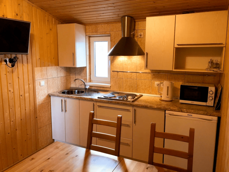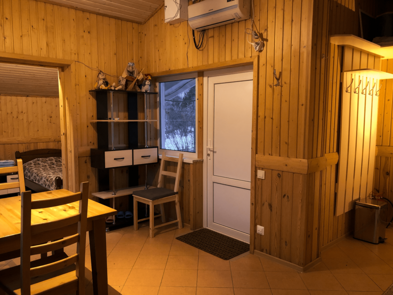 Для гостей подготовлены три полностью благоустроенных домика. В каждом имеется горячая вода, теплые полы и Wi-Fi. Собственные кухни оборудованы плитой, микроволновой печью, холодильником и чайником. Также имеется вся необходимая посуда и столовые приборы.