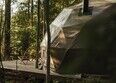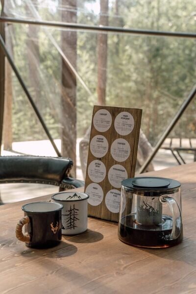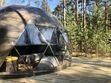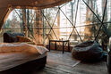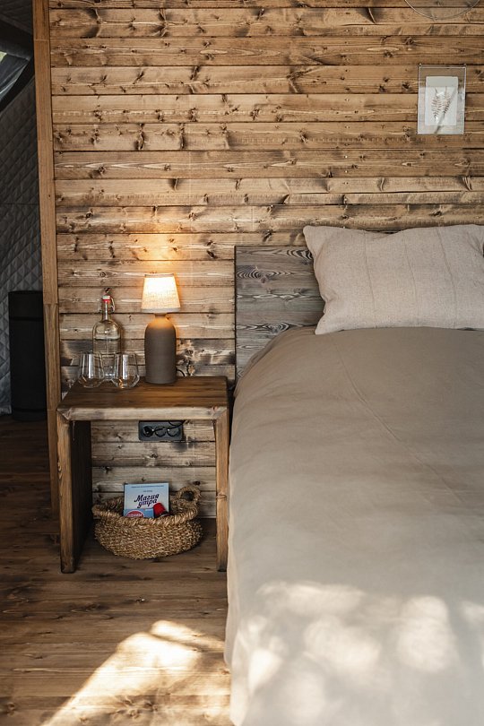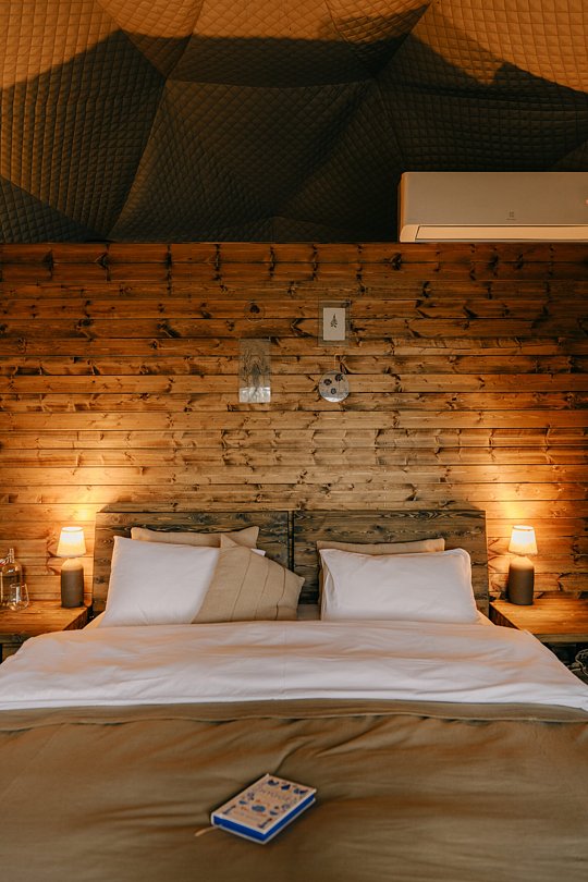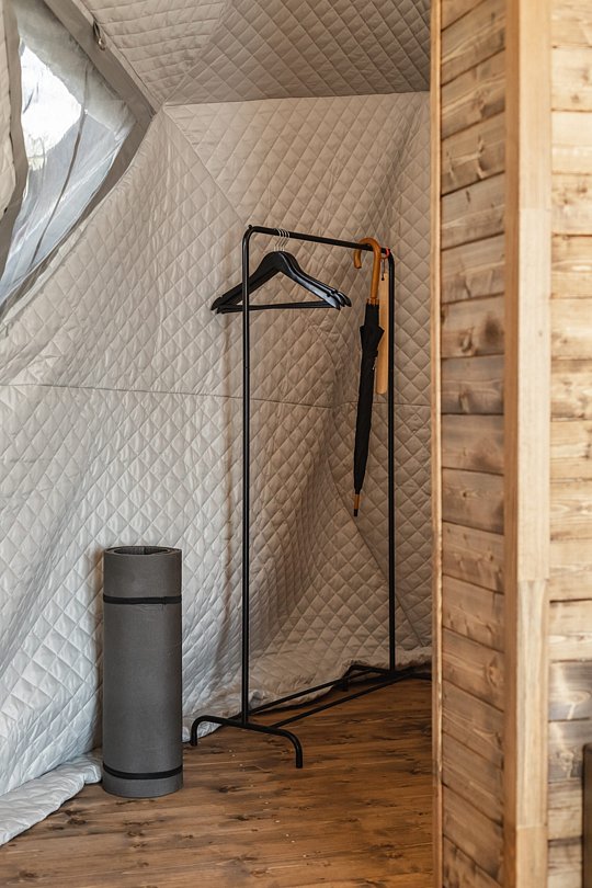 Всего на территории имеется 10 жилых модулей. В каждом из них есть двуспальная широкая кровать с белоснежным постельным бельем, биотуалет, умывальник в стиле деревенской бабушки, розетки, продуманная вентиляция, чугунная печь и, конечно, большое панорамное окно, из которого открывается вид на природу.