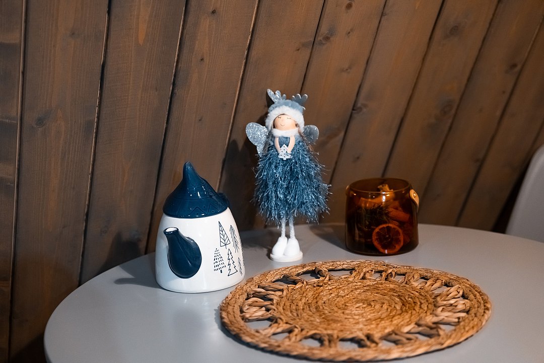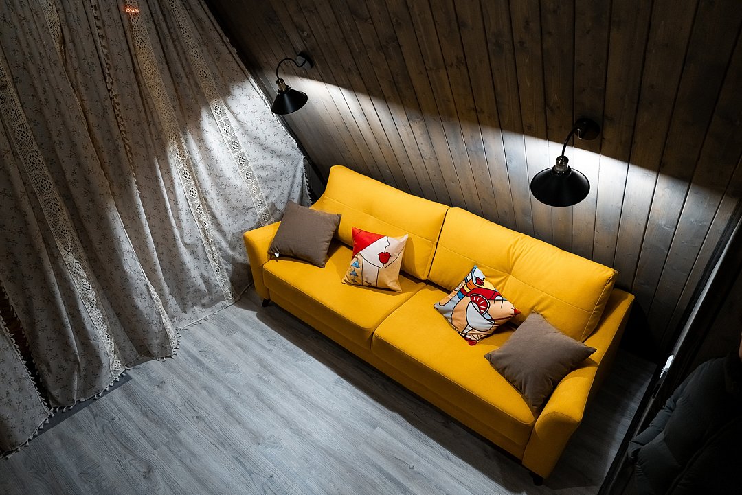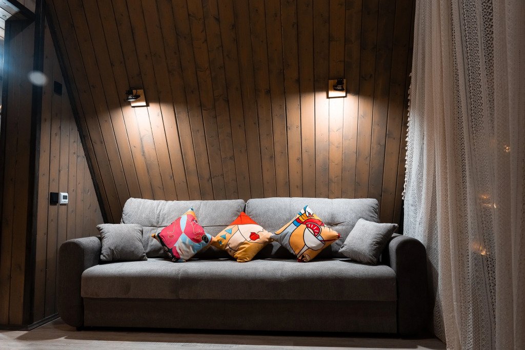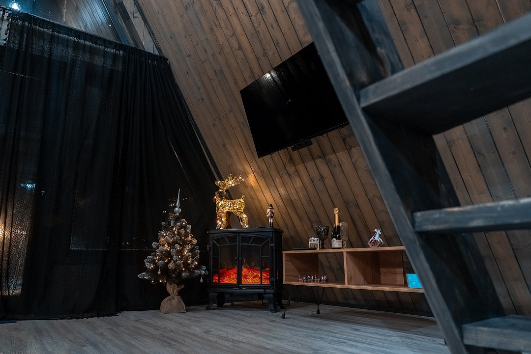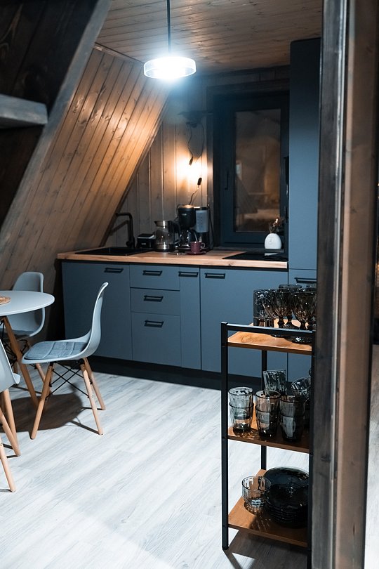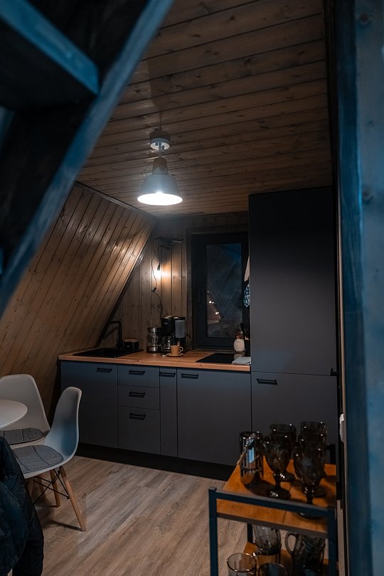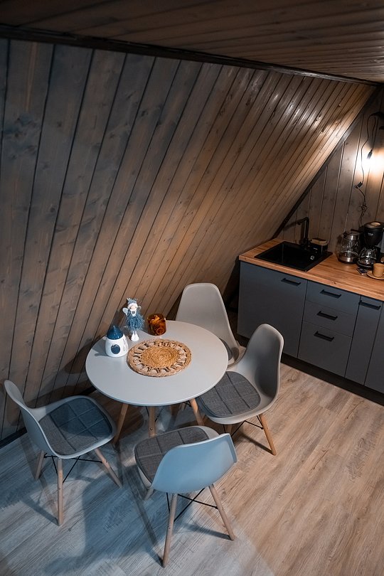 В каждом доме имеется: полностью оборудованная кухня-гостиная с полноценным раскладным диваном на 2 спальных места. В распоряжении гостей столовые приборы, кастрюли, сковородки, чайник, микроволновка, холодильник, плита. Для любителей кофе имеется кофемашина. На втором этаже большая двуспальная кровать с ортопедическим матрасом. Мягкое постельное белье. При необходимости можно оборудовать 5 спальное место, за дополнительную стоимость.