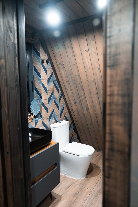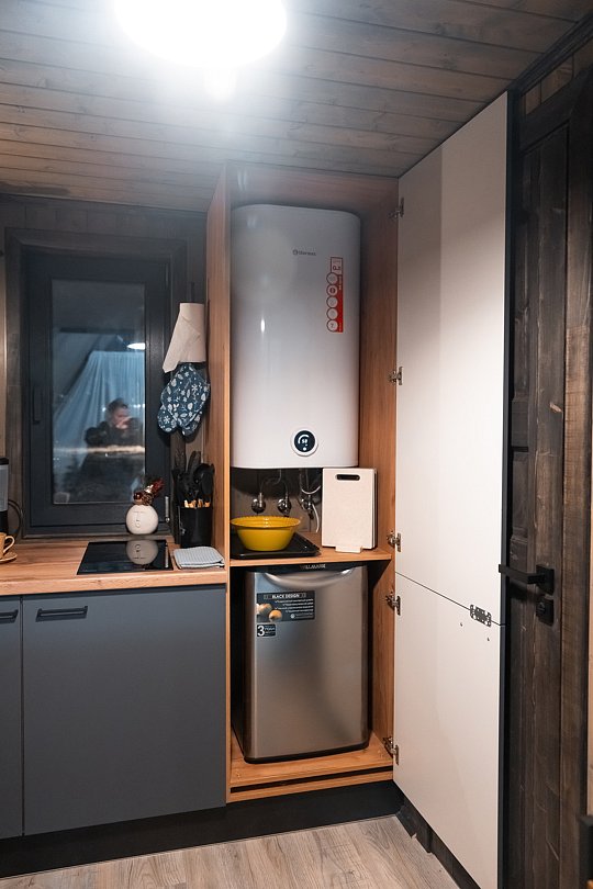 В каждом доме имеется: полностью оборудованная кухня-гостиная с полноценным раскладным диваном на 2 спальных места