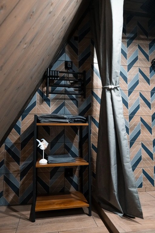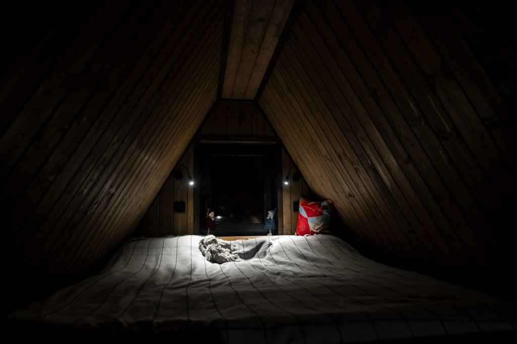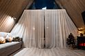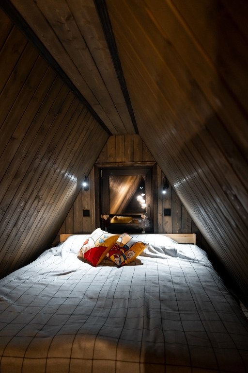 На втором этаже большая двуспальная кровать с ортопедическим матрасом. Мягкое постельное белье.