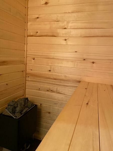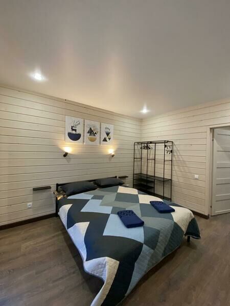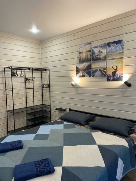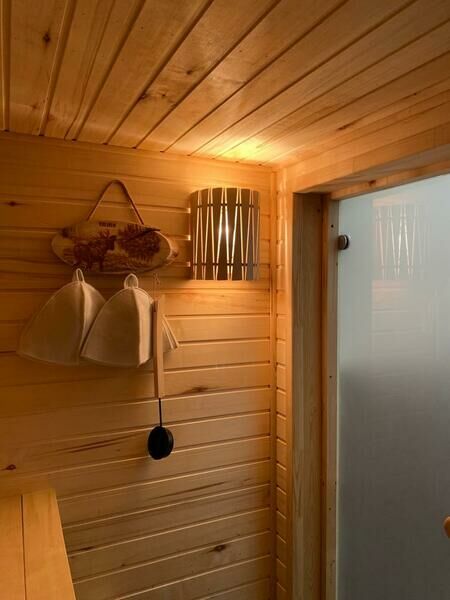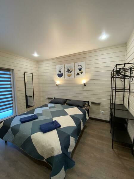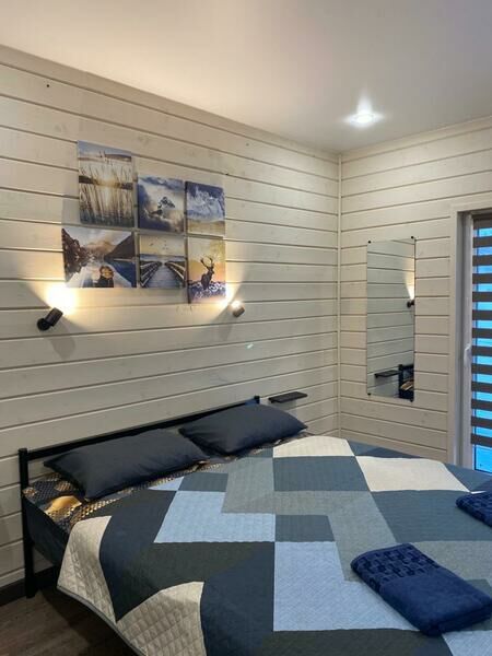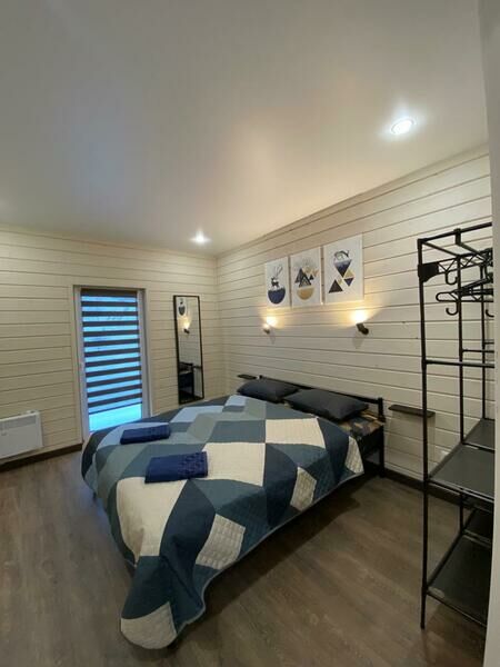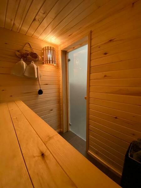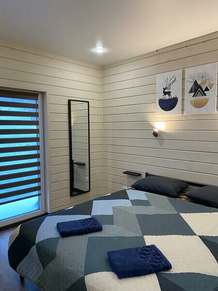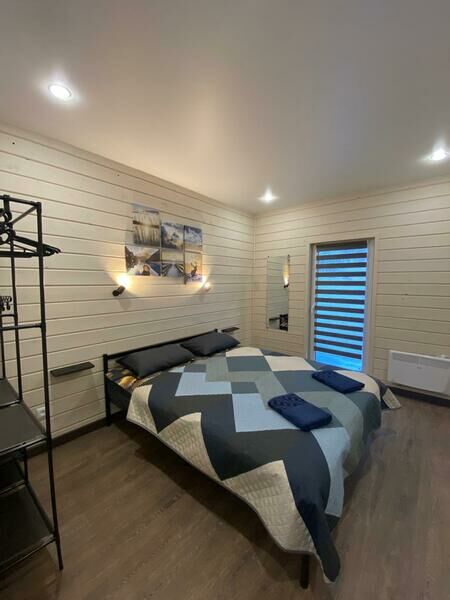 Дом, площадью 76 кв.м состоит из прихожей, двух спален с одной двуспальной кроватью в каждой, кухни-гостиной, оборудованной всем необходимым: холодильником, микроволновой печью, посудой, варочной панелью, душевой комнатой и отдельным санузлом, собственной сауной. Панорамное остекление и терраса 30 кв.м. для 6 человек.
