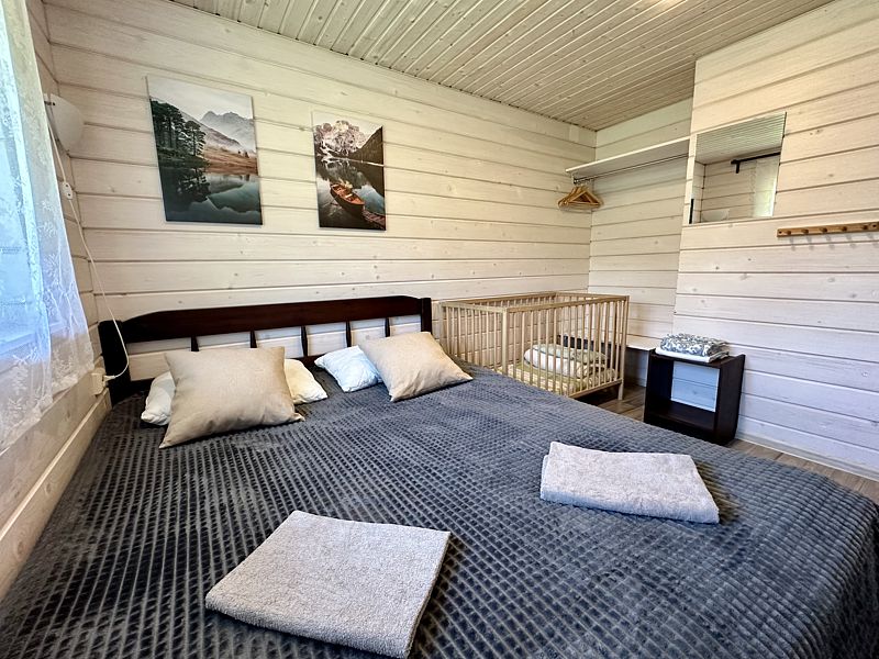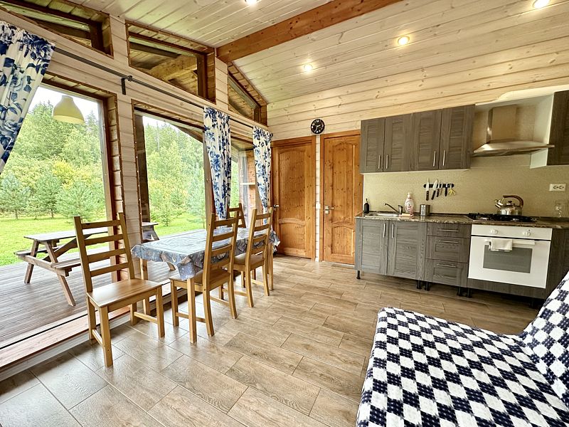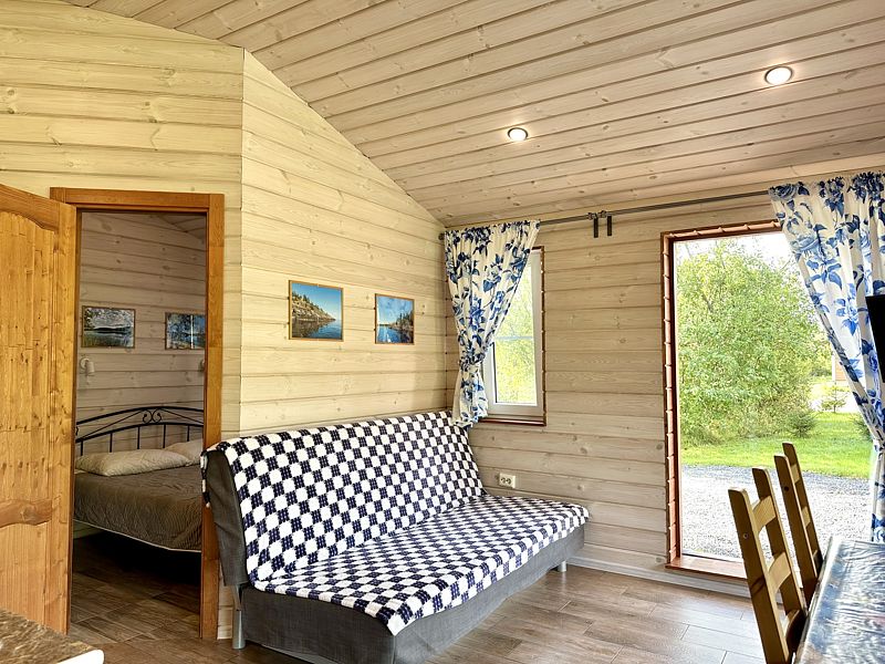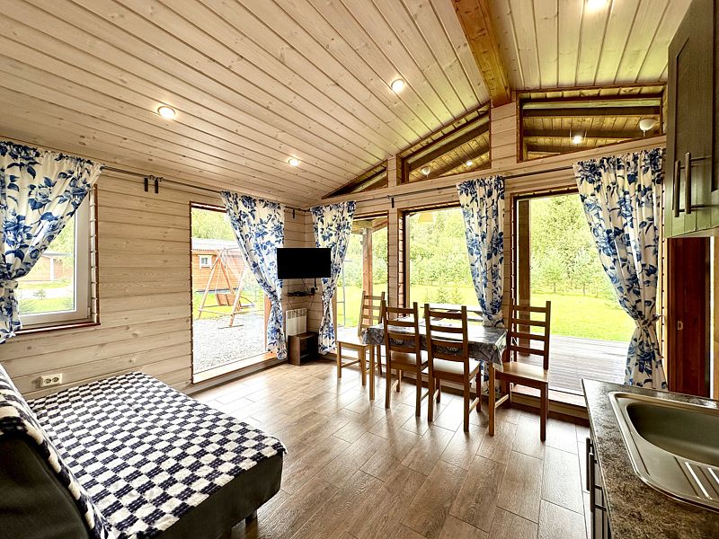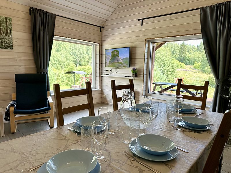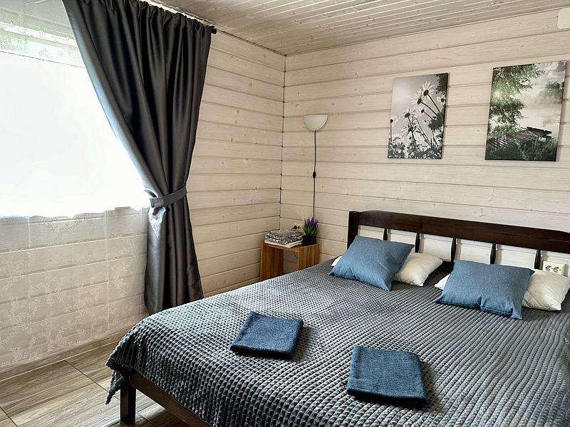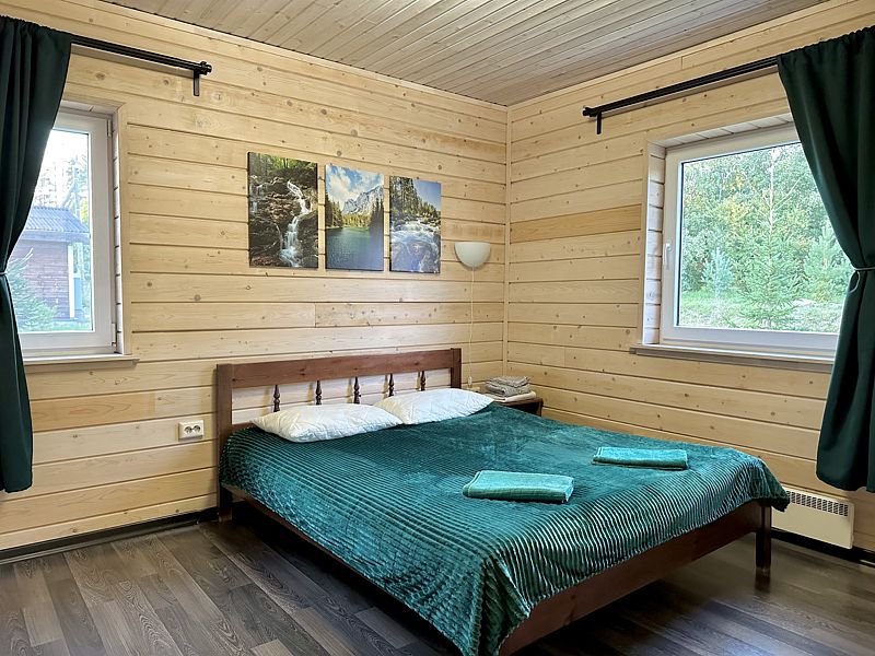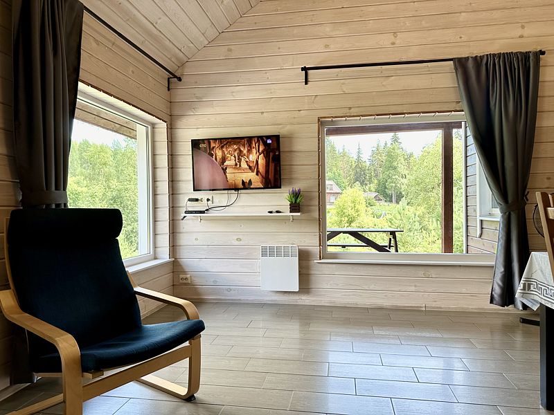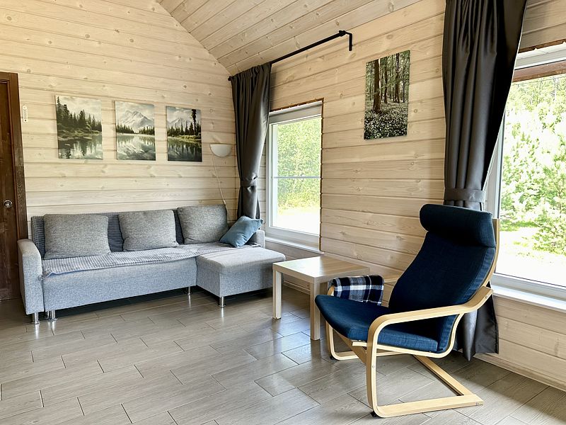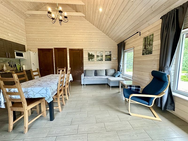 Семейный отдыхДостоинстваСовременные домики со всеми удобствами. Всё, что надо для комфортного и спокойного отдыха. Гостинная с кухней, спальня, сауна, веранда. Лужайка перед домом, стоянка. До центра города 4 км, рынок, все магазины для покупок. Лес с грибами и ягодами, озеро с островами для любителей рыбалки. Отдыхали 10 дней в сентябре, с погодой повезло.