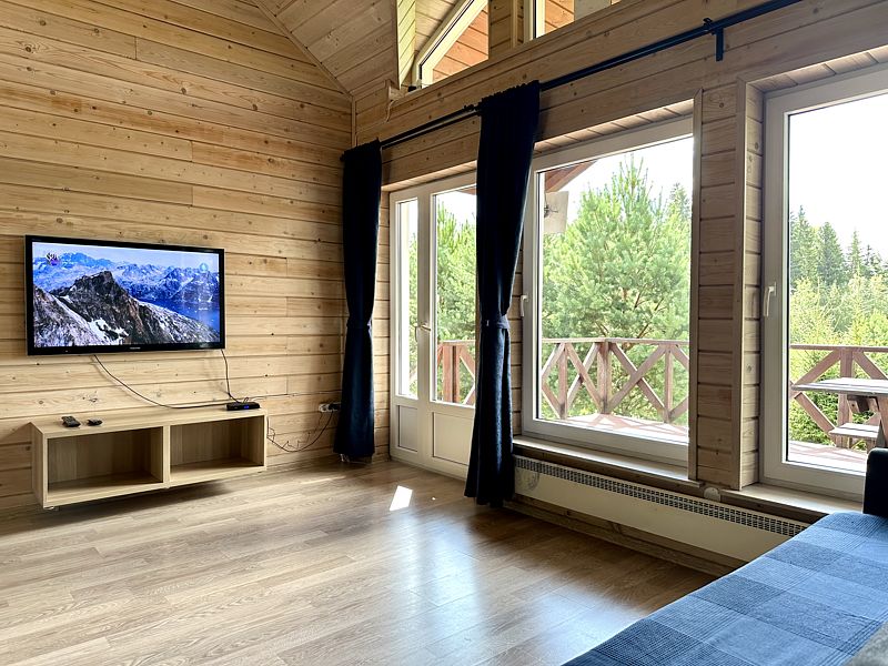 В каждом коттедже сауна, просторный сан. узел (душ, туалет), оборудованная всем необходимым кухня (газовая варочная поверхность, духовка, микроволновая печь, холодильник, посуда на 4 персоны), обеденный стол, спутниковое ТВ, wi-fi, удобный двуспальный диван, спальня с широкой двуспальной кроватью, терраса с мебелью. В коттедже есть стиральная машина, фен, гладильная доска, утюг и сушилка. Прекрасный вид из панорамных окон. Площадь коттеджа 36 кв. м. , плюс 15 кв. м. терраса.