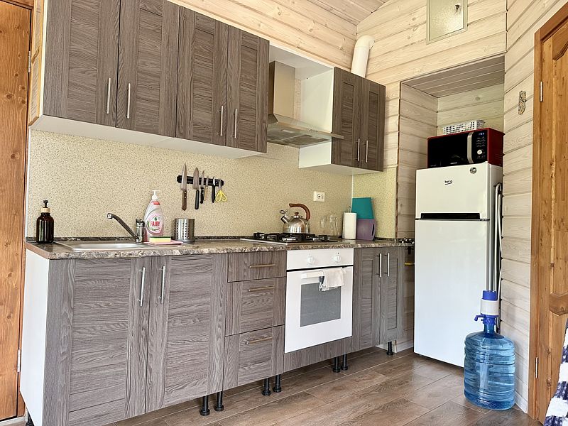 Питание осуществляется самостоятельно: в каждом коттедже имеется полностью оборудованная кухня (варочная поверхность, духовой шкаф, СВЧ-печь, посудомоечная машина (кроме коттеджа с одной спальней), холодильник, посуда, шампура).