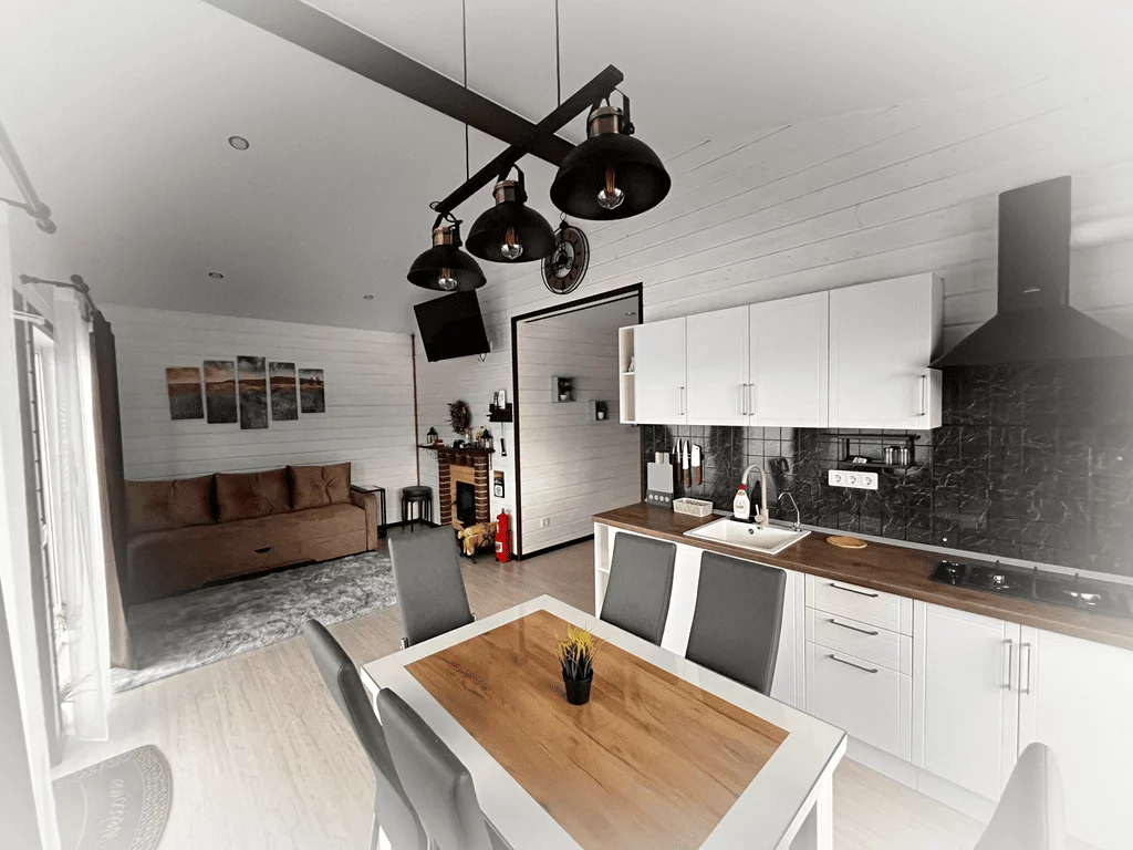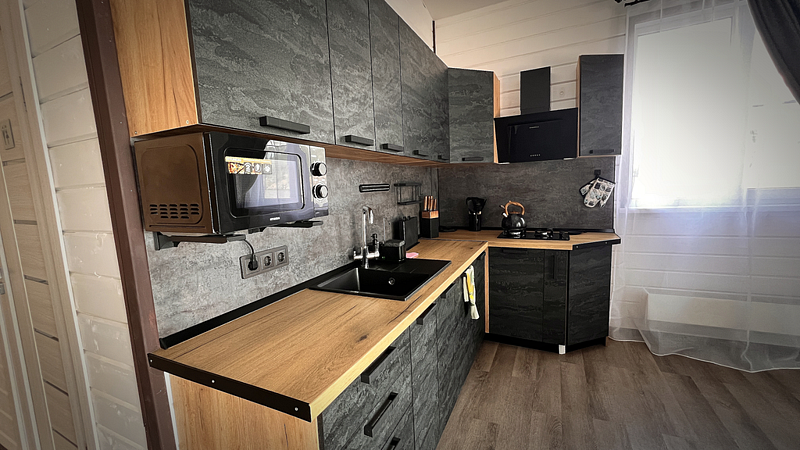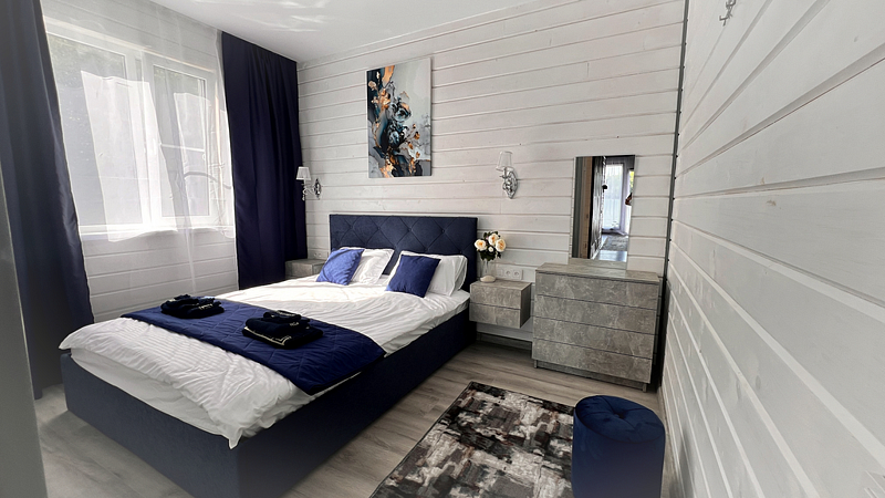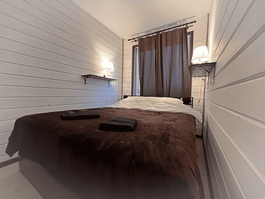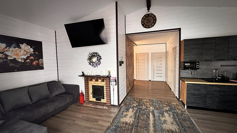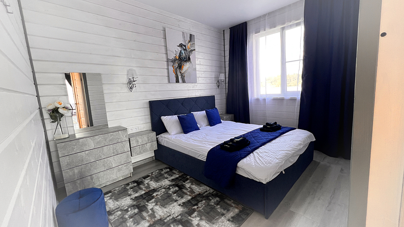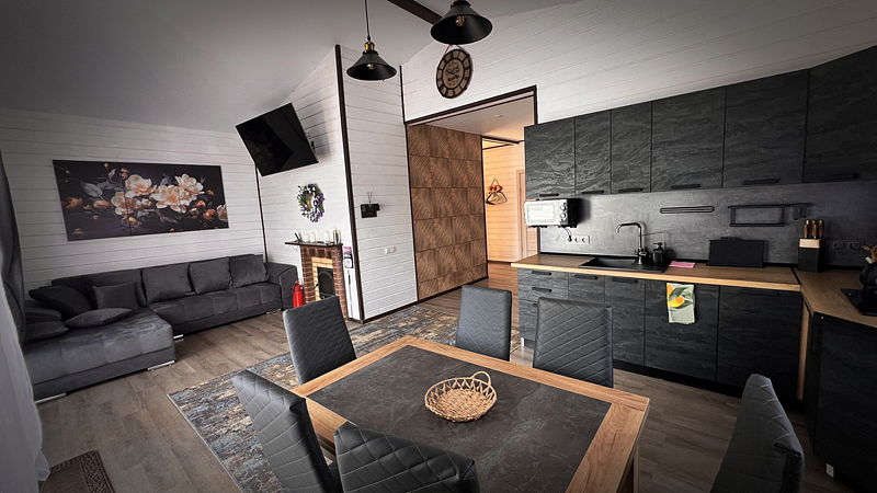 Дом рассчитан до восьми гостей (шесть основных плюс два дополнительных места). Высокие потолки пять метров. Две просторные спальные комнаты, в каждой одна широкая двуспальная кровать (сто шестьдесят сантиметров) и второй ярус — односпальная (девяносто сантиметров). В зале широкий (два с половиной метра) раскладывающийся угловой диван. Комфортно восемь спальных мест.