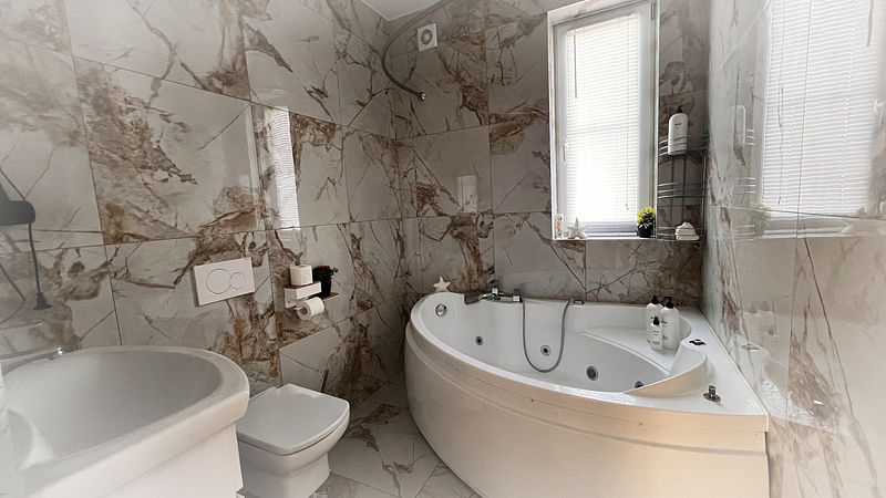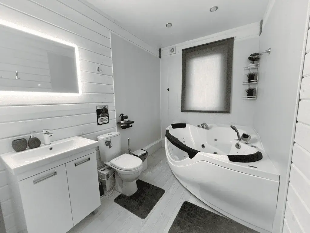 Видовая беседка на скале входит в стоимость. В самом доме расположен просторный душ и туалет с современным септиком. Горячая вода имеется. Сотовая связь ловит. В доме везде предусмотрена система теплого пола и водяного отопления.