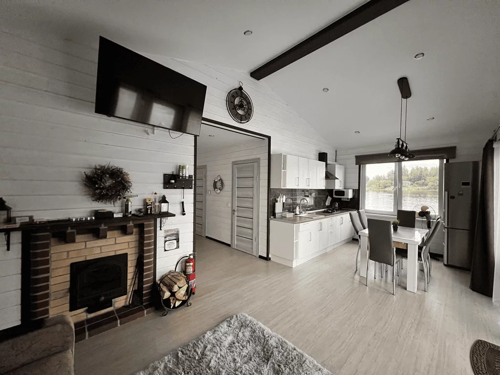 Система теплых полов по всему дому. Дом зимний теплый. Горячая вода без ограничений (никаких бойлеров), быстрый Wi-Fi для гостей, телевидение, камин на дровах, современный душ и туалет с септиком, кухня, микроволновка. Фильтр для воды. Большая терраса для отдыха с лестницей в воду. Оснащена мебелью. Мангальная зона для шашлыка (решетки и шампура имеются). Вся необходимая посуда, постельное белье, полотенце и тапочки.