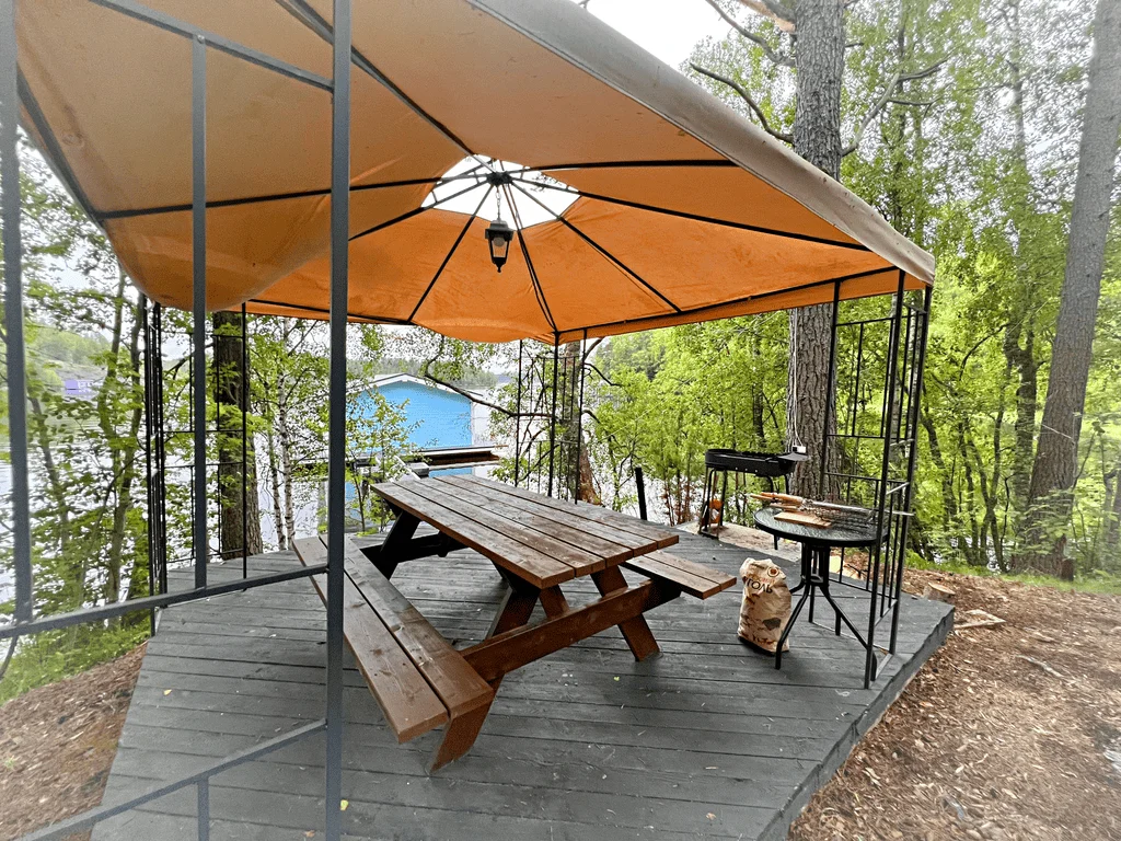 Беседка с камином, необходимой мебелью и набором посуды возле большого бревенчатого дома на берегу.