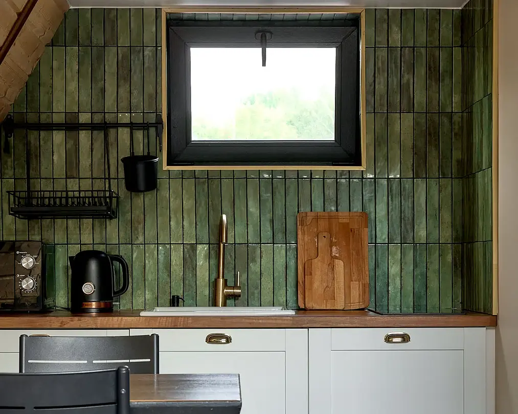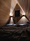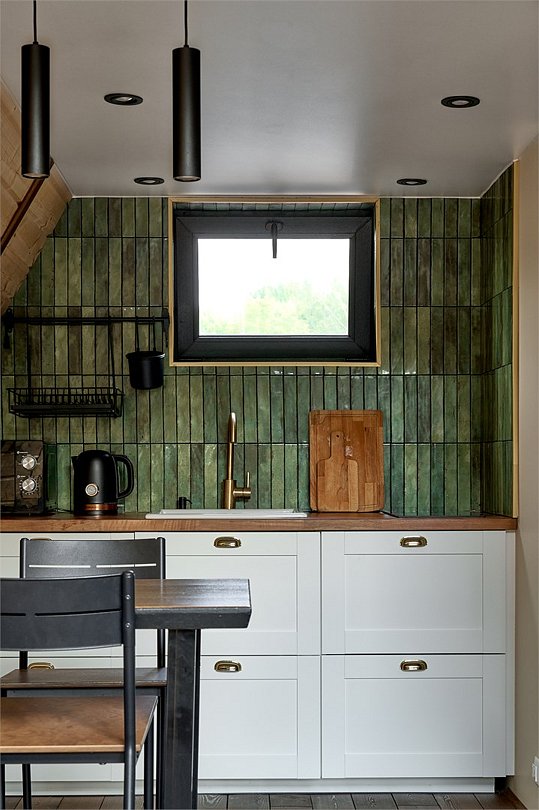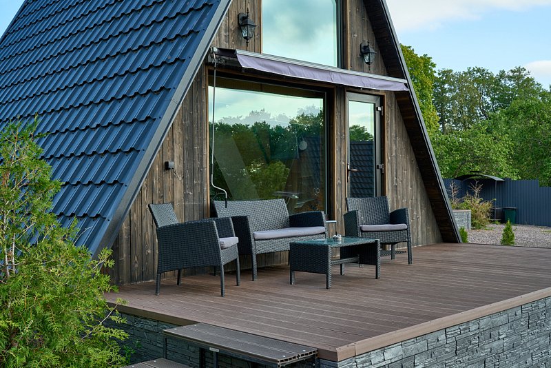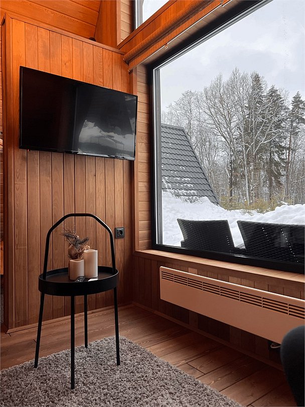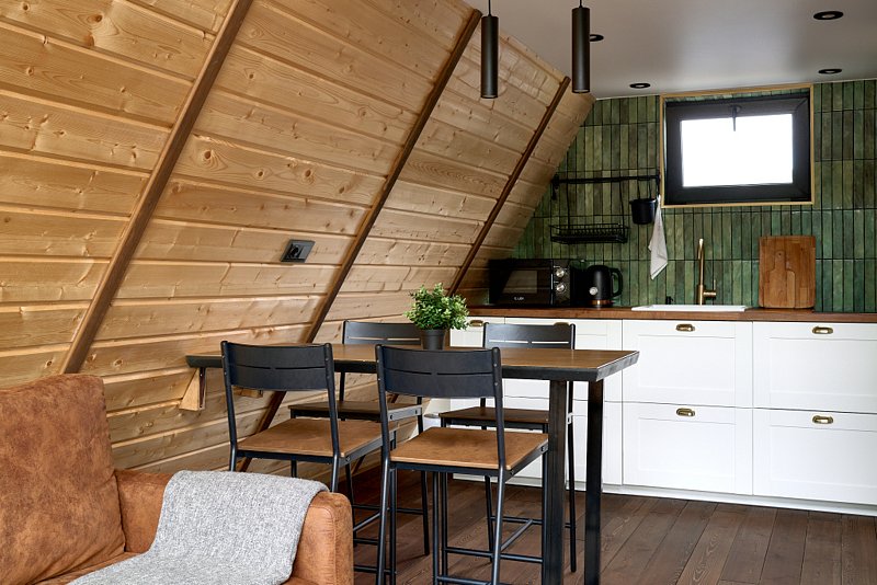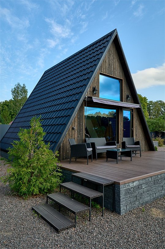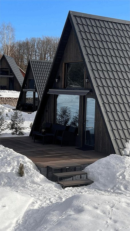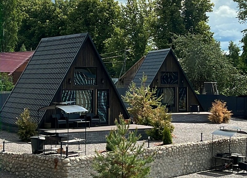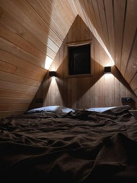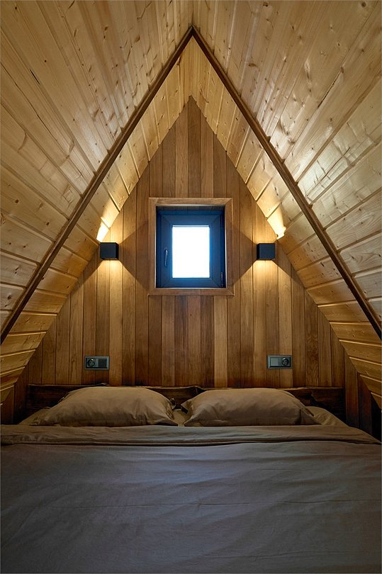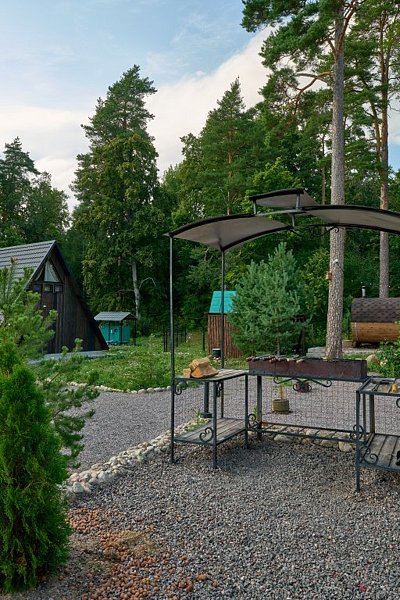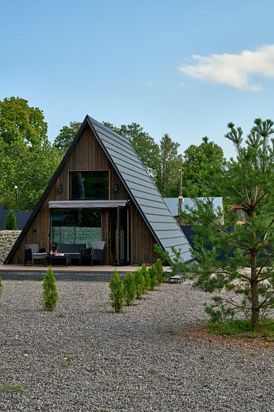 Для проживания гостей предлагаются уютные треугольные домики-шале вместимостью до 4 человек. В домиках есть все необходимое для вашего комфортного пребывания. Имеется кухонная зона, оснащенная бытовой техникой и набором посуды, уютное пространство для отдыха с телевизором, современный санузел с душем, бесплатный Wi-Fi, терраса с удобной мебелью с видом на лес или залив. У каждого шале свой мангал для приготовления блюд на свежем воздухе. Решетки и шампуры предоставляются.