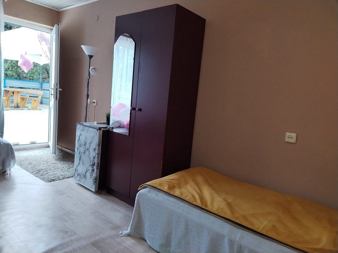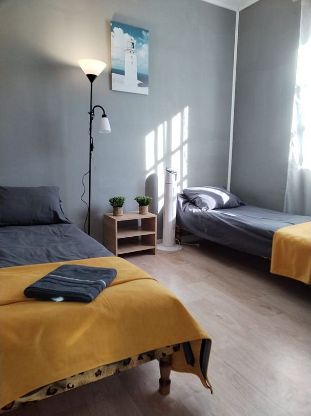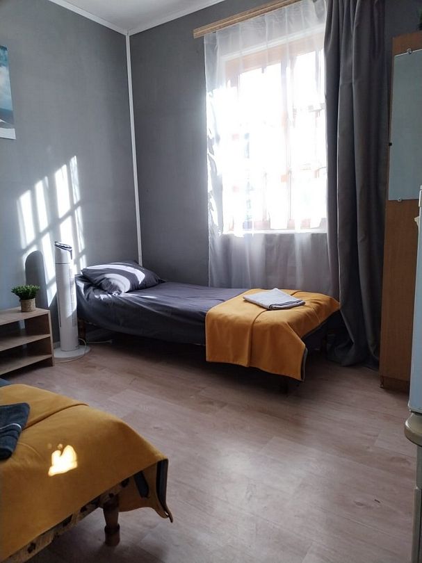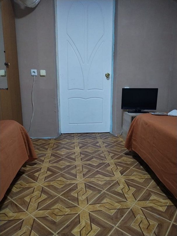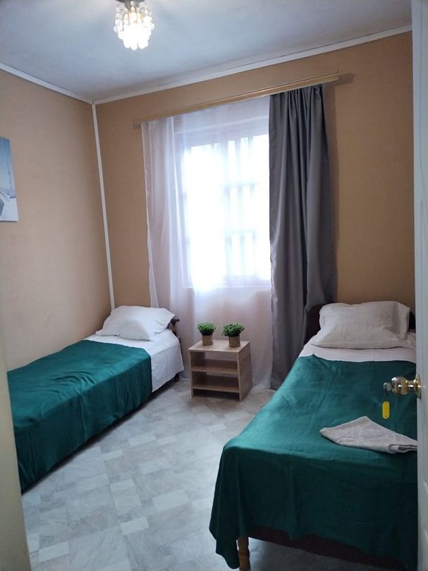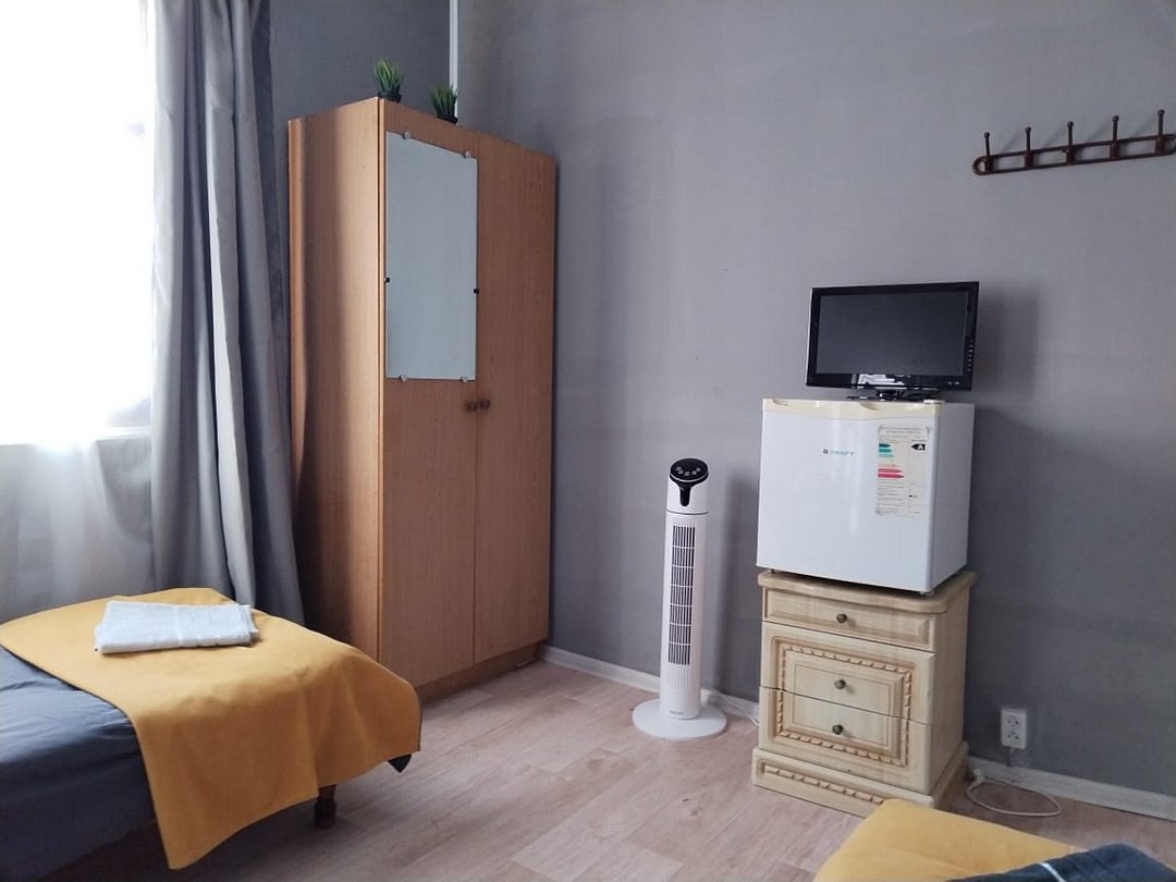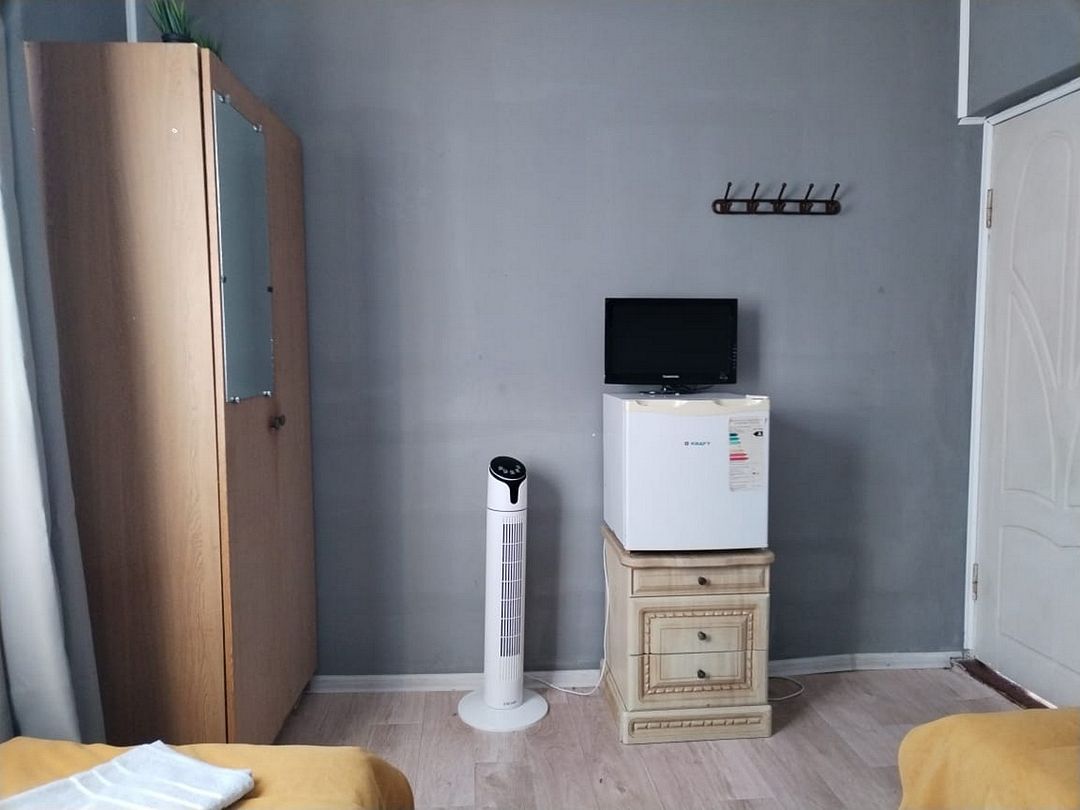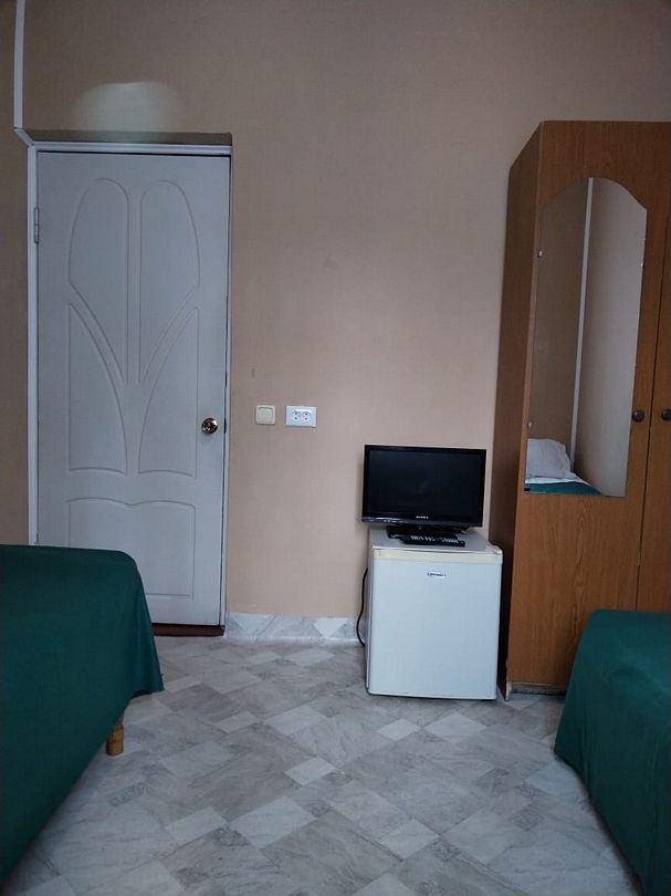 2 односпальные кровати. Имеется телевизор, вентилятор, шкаф, вешалка, комод, холодильник.