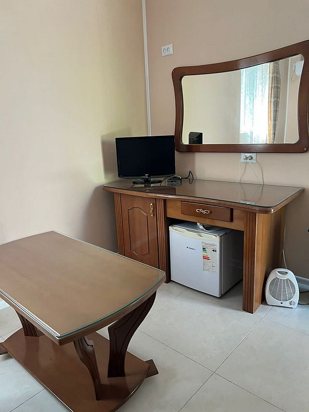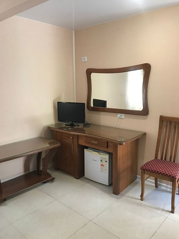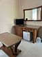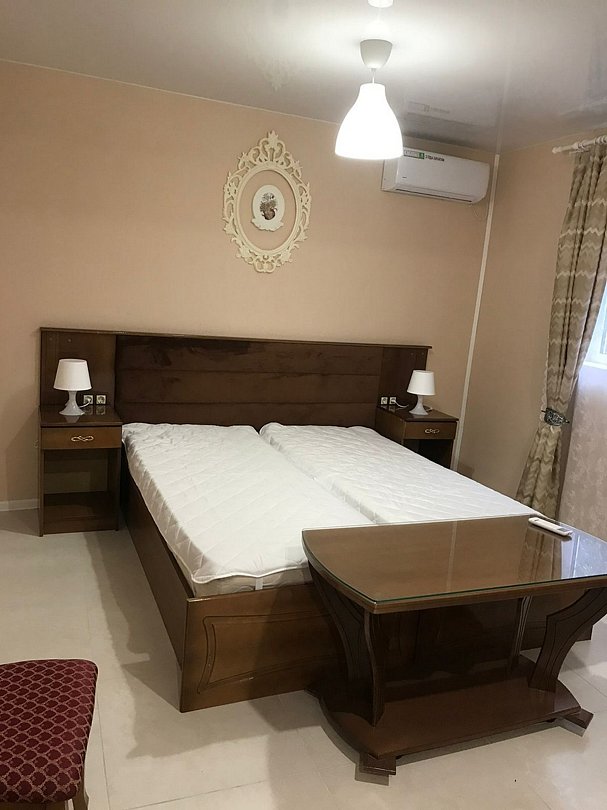 1 двуспальная кровать или 2 односпальные кровати. Имеется телевизор, кондиционер, шкаф, вешалка, рабочий стол, стулья, электрический чайник, холодильник, фен.