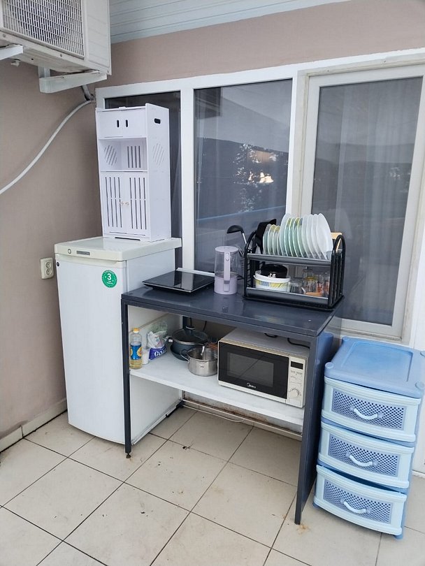 Имеется телевизор, кондиционер, шкаф, вешалка, журнальный столик, стулья, кухня, посуда, столовые приборы, микроволновая печь, электрическая плита, мультиварка, электрический чайник, холодильник, фен.