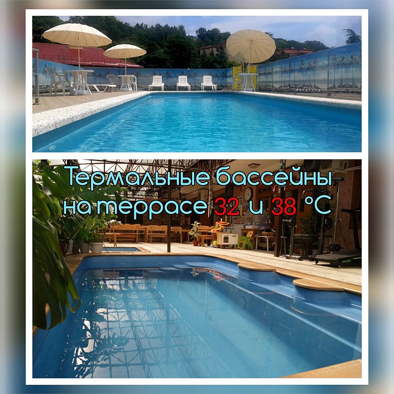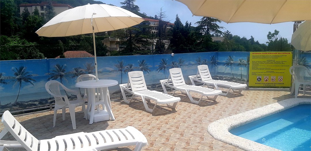 На зеленой территории отеля гости могут посидеть компанией в тени банановых пальм — в беседке или у мангала за столиками с бокалом вина и шашлыком. Имеются два бассейна с подогревом и навесами — взрослый и детский, что позволяет купаться в любую погоду. Также отдыхающие могут попариться в сауне, поиграть в теннис, а для желающих администрация отеля организует экскурсии различной направленности.