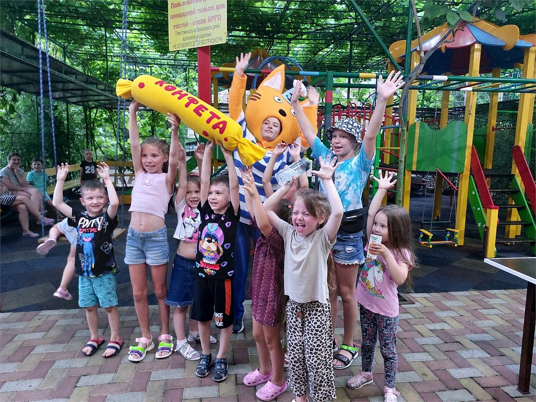 Отель ориентирован на семейный отдых, и детям здесь скучать не придется. С ними работают аниматоры — проводят различные игры, конкурсы, готовят выступления для родителей. На территории «Арго» организован контактный зоопарк, в котором животных можно потрогать и погладить. Малыши могут покупаться в бассейне, поиграть на детской площадке.