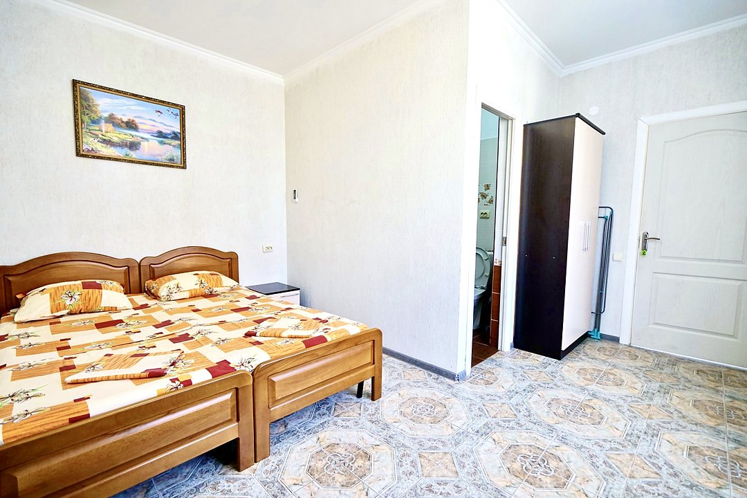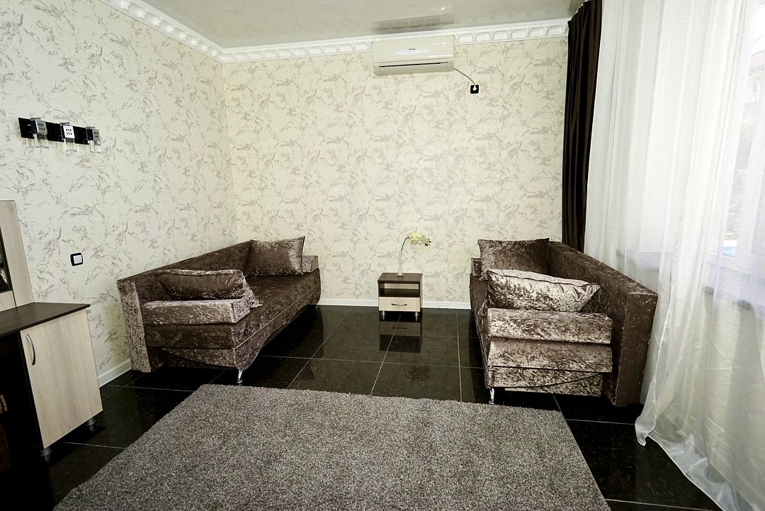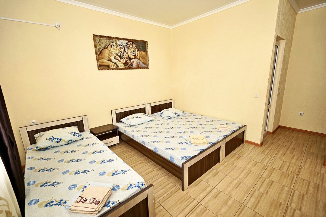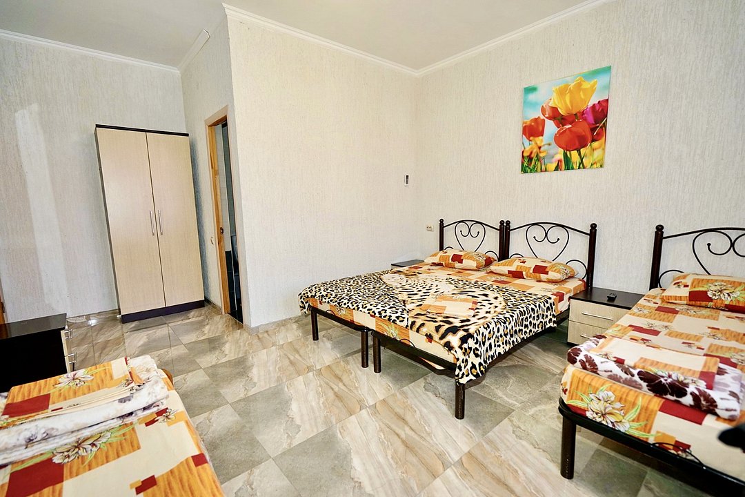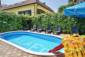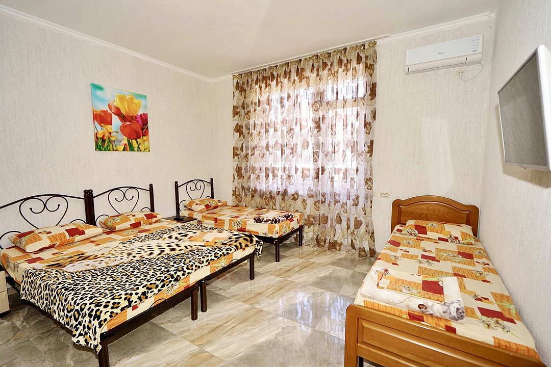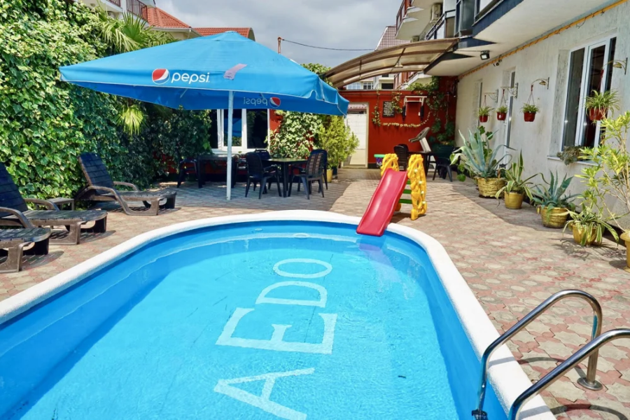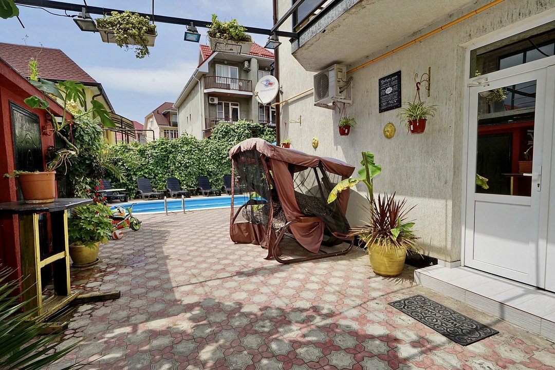 Гостям предлагаются просторные номера, оснащенные всем необходимым для комфортного проживания: кондиционером, холодильником и телевизором. Ухоженный двор с зоной для отдыха, столами под навесами и летней кухней создает атмосферу уюта и расслабления. В дополнение к этому, гости могут наслаждаться теплым бассейном с детской горкой, а также зоной для барбекю, что делает вечера незабываемыми.