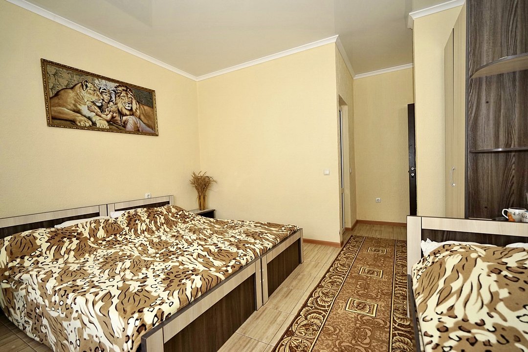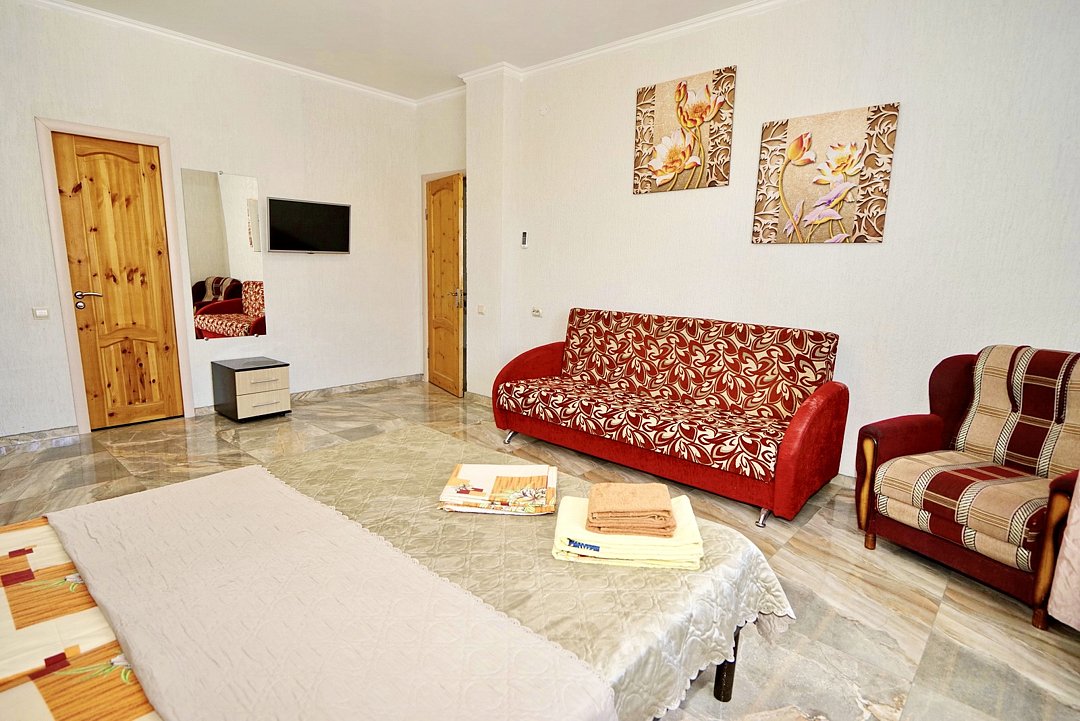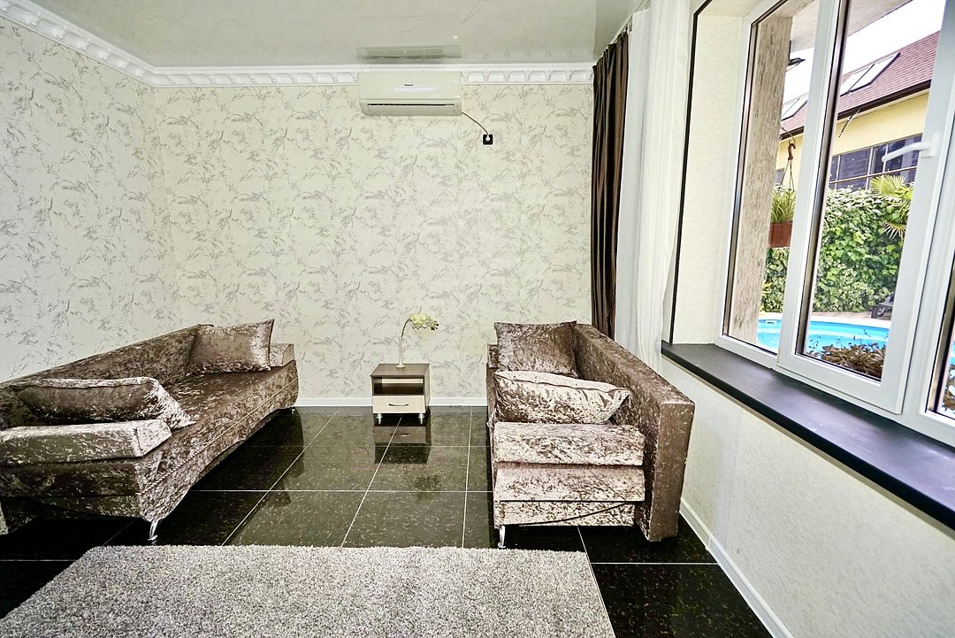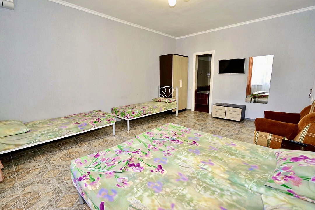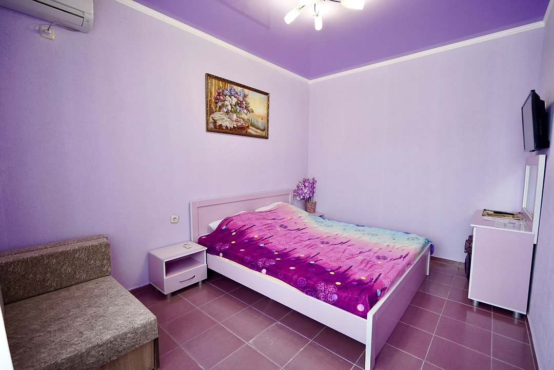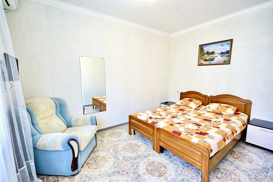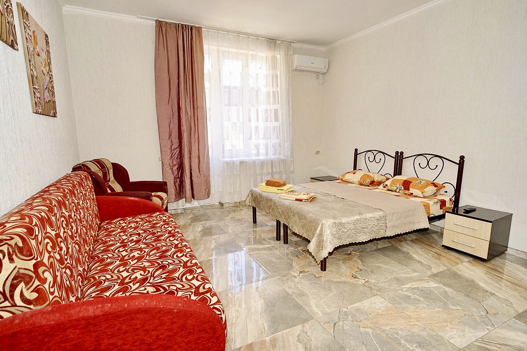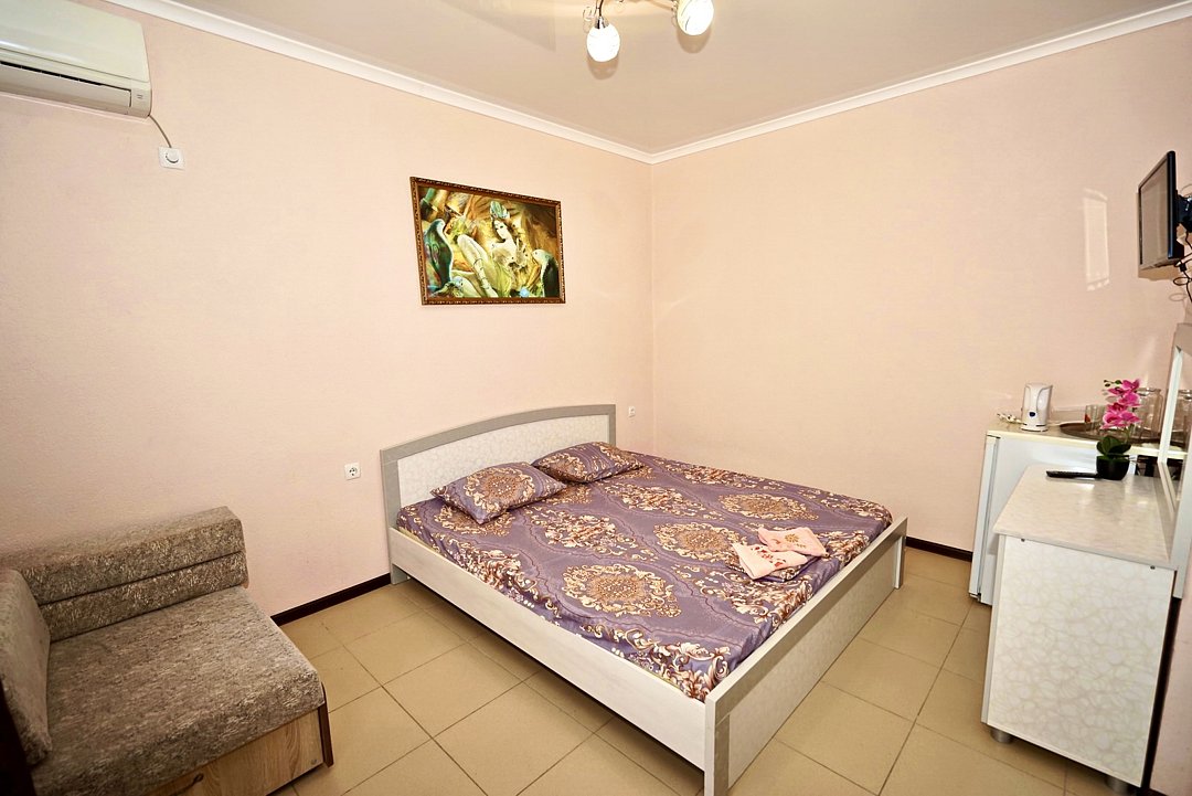 Гостям предлагаются просторные номера, оснащенные всем необходимым для комфортного проживания: кондиционером, холодильником и телевизором. Ухоженный двор с зоной для отдыха, столами под навесами и летней кухней создает атмосферу уюта и расслабления. В дополнение к этому, гости могут наслаждаться теплым бассейном с детской горкой, а также зоной для барбекю, что делает вечера незабываемыми.