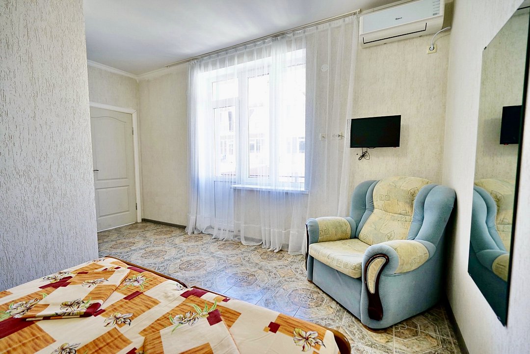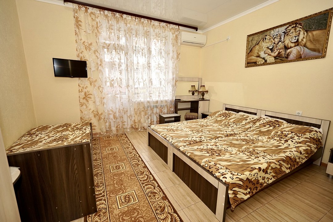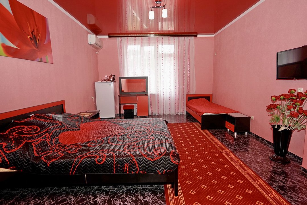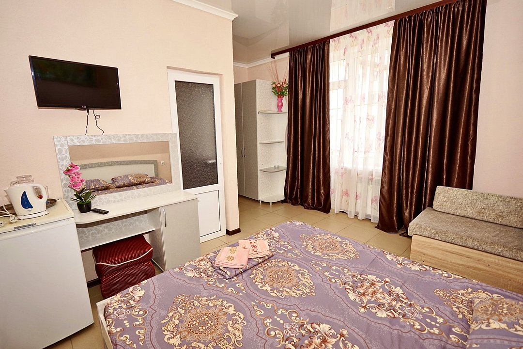 Комфортные номера со всей необходимой техникой. Кровати, прикроватные тумбы, стол, стулья, шкаф, вешалки, зеркало, постельное белье, полотенца, телевизор, интернет кабельное, кондиционер, холодильник, санузел совмещённый.