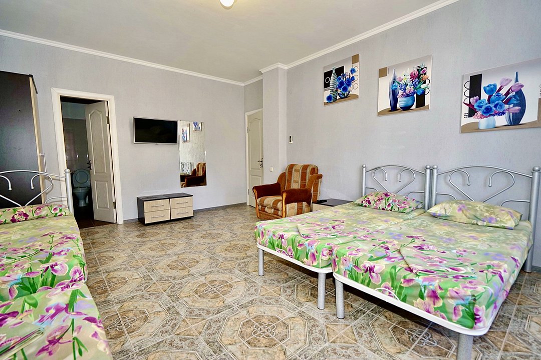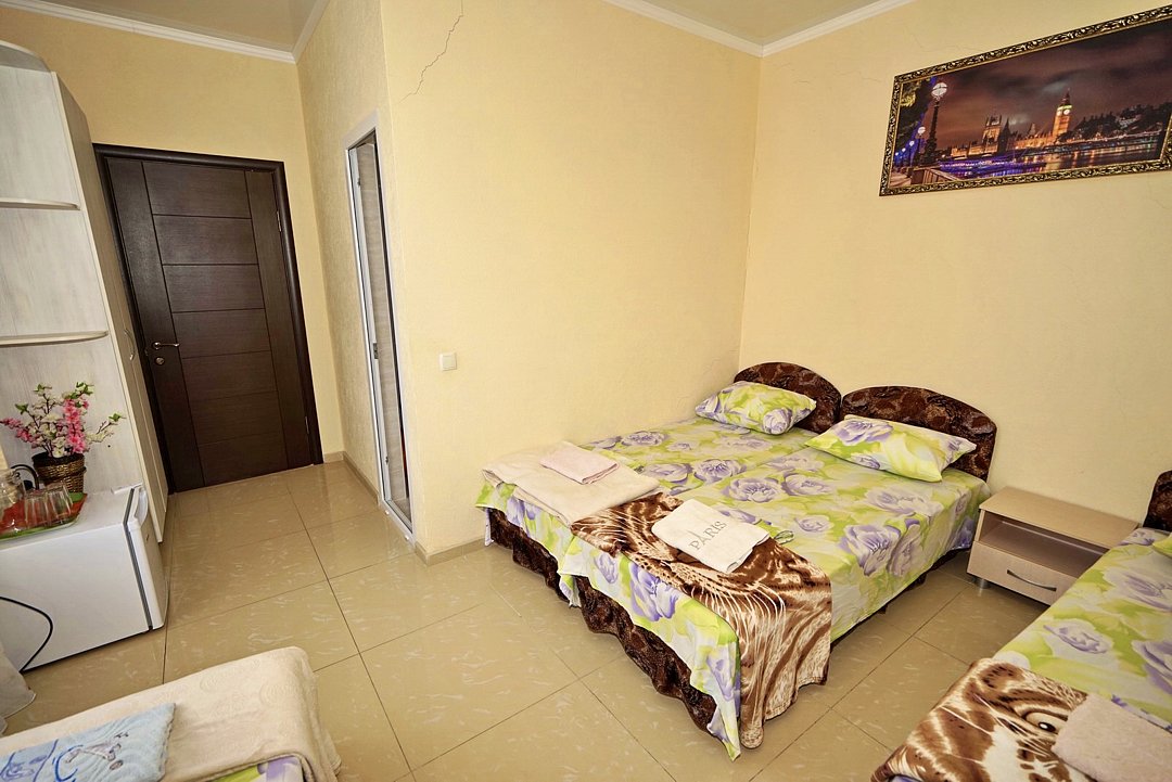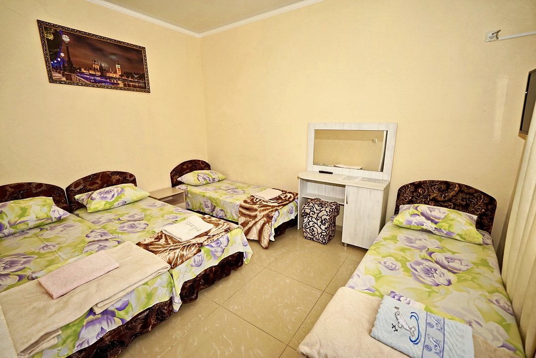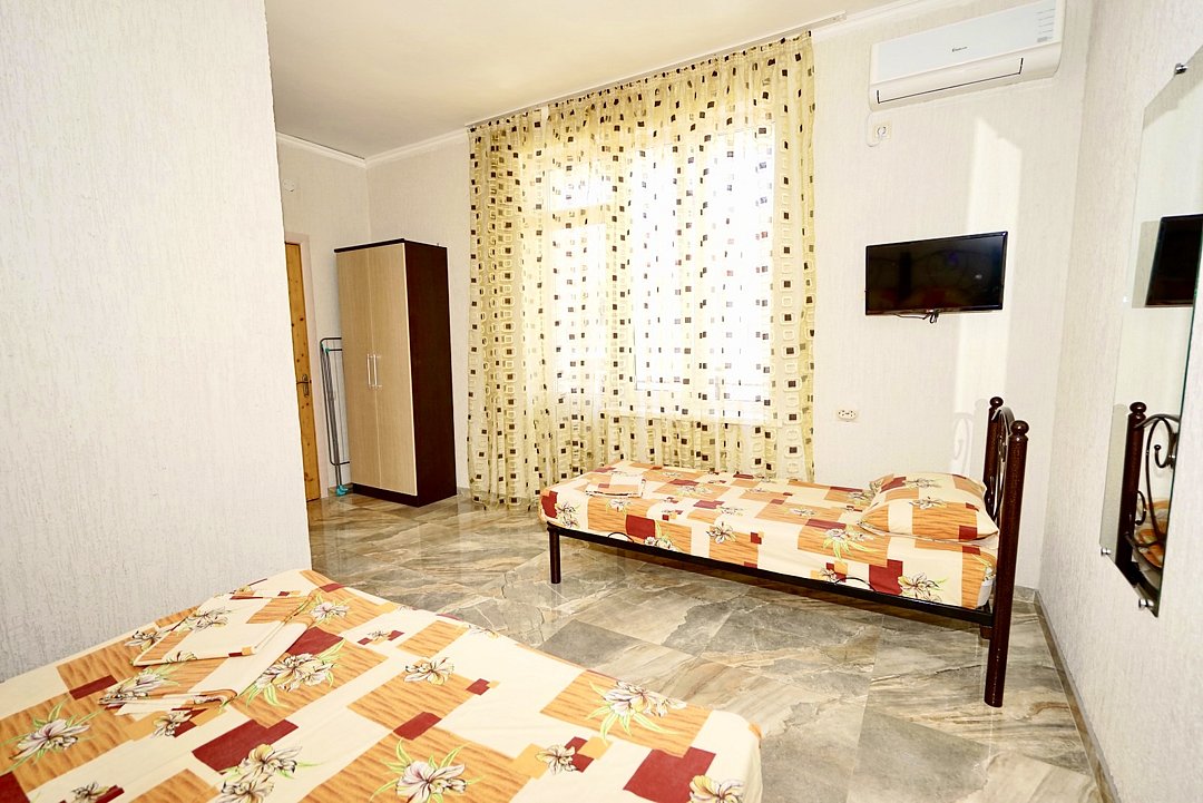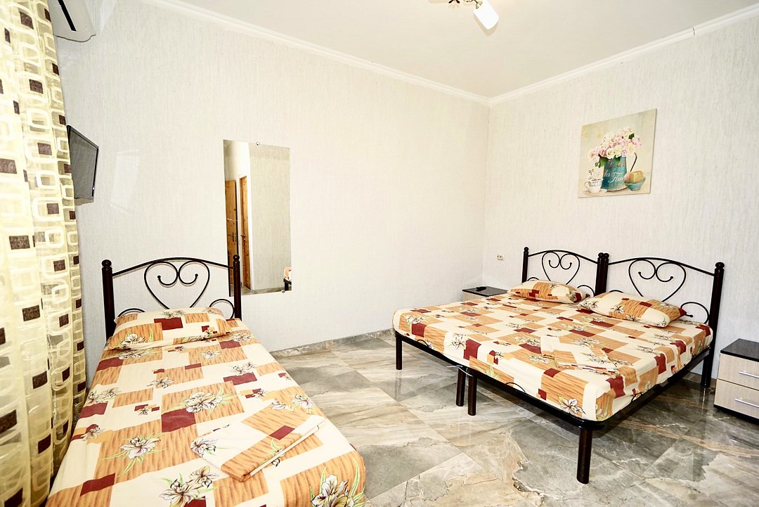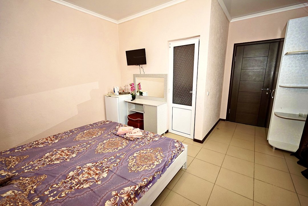 Комфортные номера со всей необходимой техникой. Кровати, прикроватные тумбы, стол, стулья, шкаф, вешалки, зеркало, постельное белье, полотенца, телевизор, интернет кабельное, кондиционер, холодильник, санузел совмещенный.