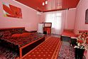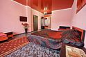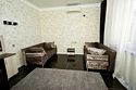 Номер «Люкс» представляет собой: кровать двуспальная и двуспальный диван. Мебель: стулья, стол, шкаф, прикроватные тумбочки, прихожая, вешалка, зеркало.